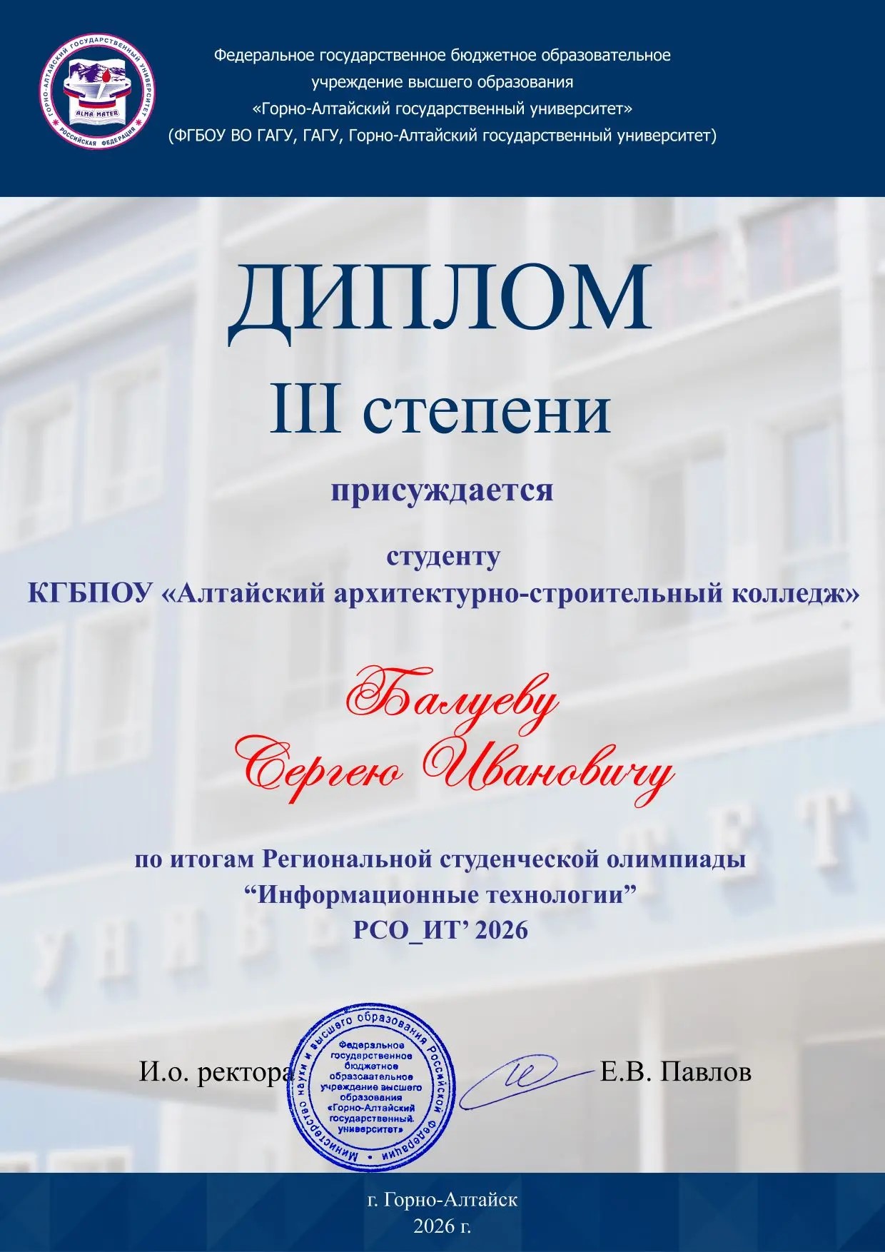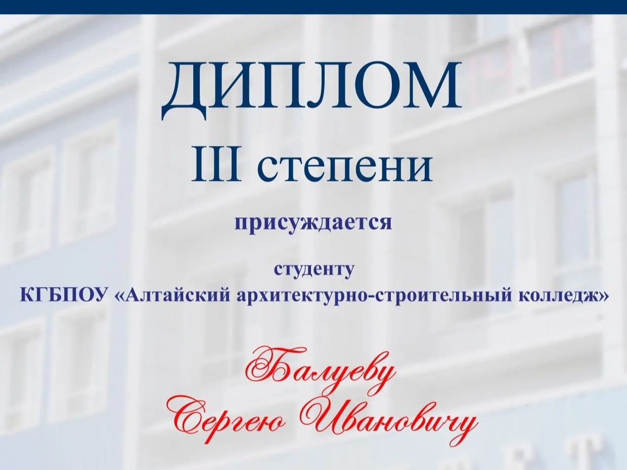 Студент Алтайского архитектурно-строительного колледжа Балуев Сергей продемонстрировал высокий уровень профессиональной подготовки на Региональной студенческой олимпиаде «Информационные технологии» РСО_ИТ'26, завоевав почётное третье место.
