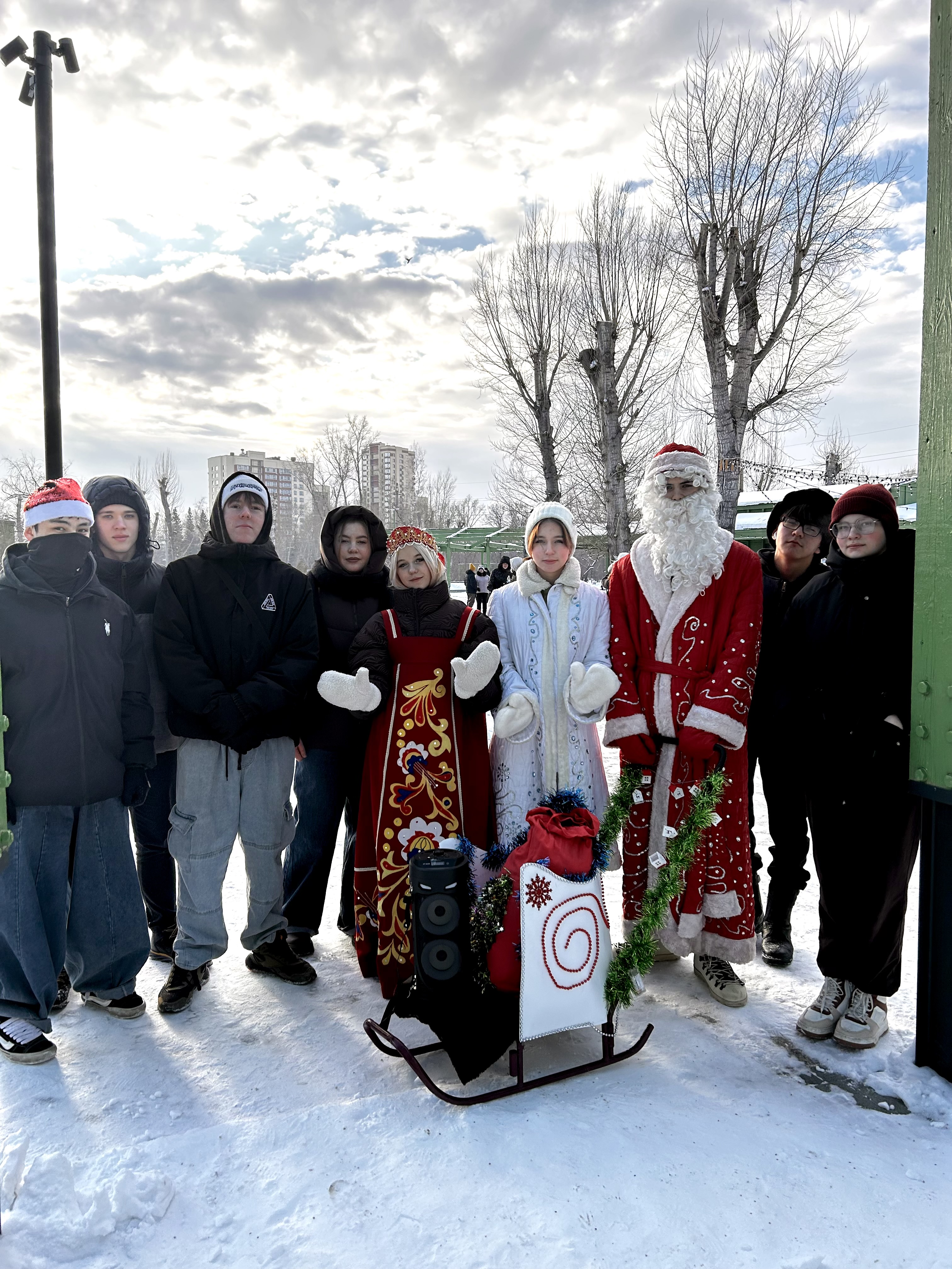 Ребята приняли участие в «эпичном сражении Дедов Морозов», что сделало мероприятие ярким и увлекательным. Для детей волонтеры подготовили танцевальную игру, участники которой получили медали и сладкие призы. В конкурсе «Лучшие новогодние санки» отряд занял первое место, выиграв главный приз. Победа стала возможной благодаря творчески украшенным санкам, над которыми девочки работали несколько часов. Над украшением санок трудились Крутикова Мария, Гладченко Виктория, Мотовилова Екатерина, Селина Виктория. Роль Деда Мороза исполнил Миллер Дмитрий. Снегурочкой была Мотовилова Екатерина. Благодаря их ярким образам мероприятие приобрело особую атмосферу и настроение.
