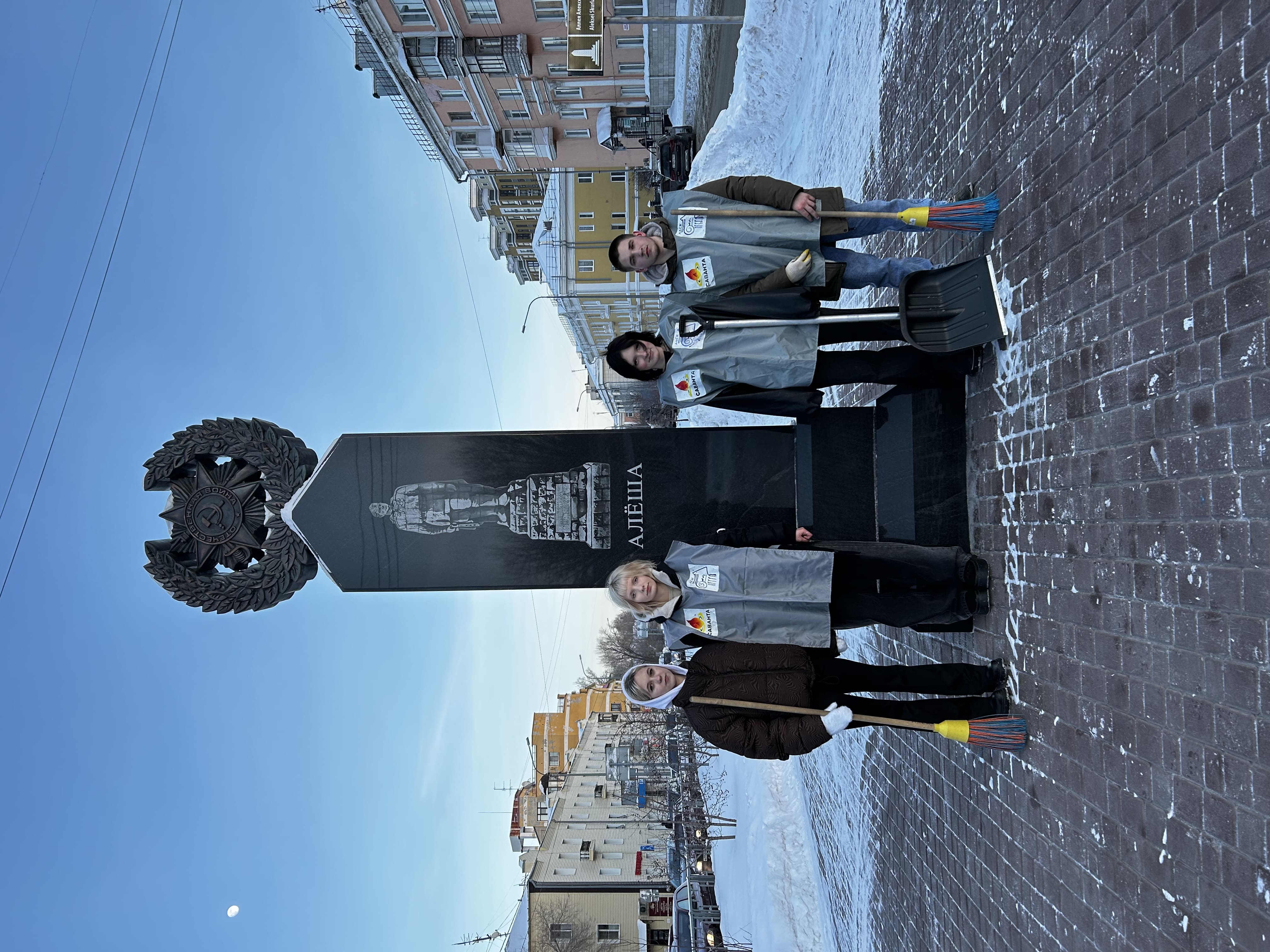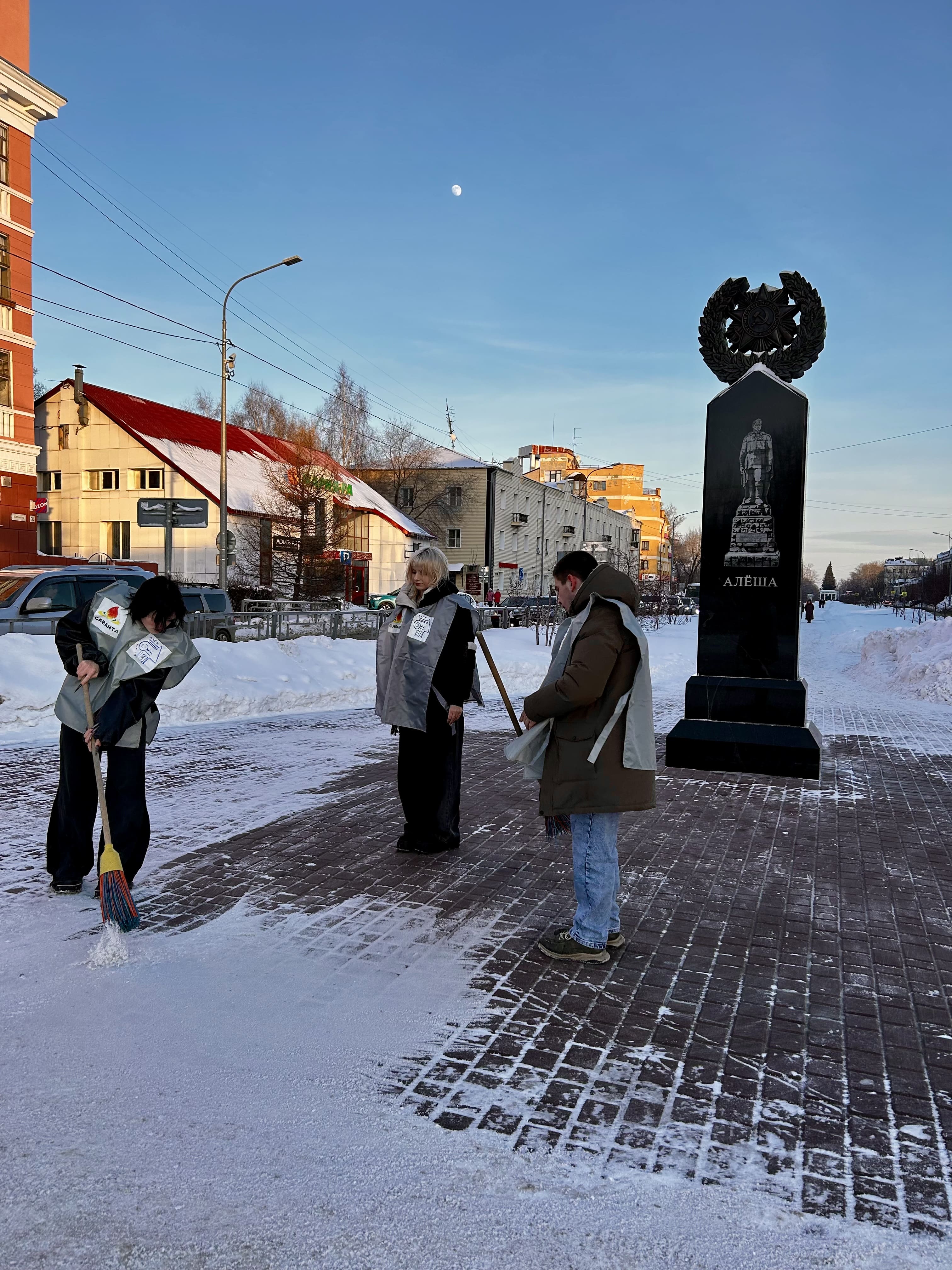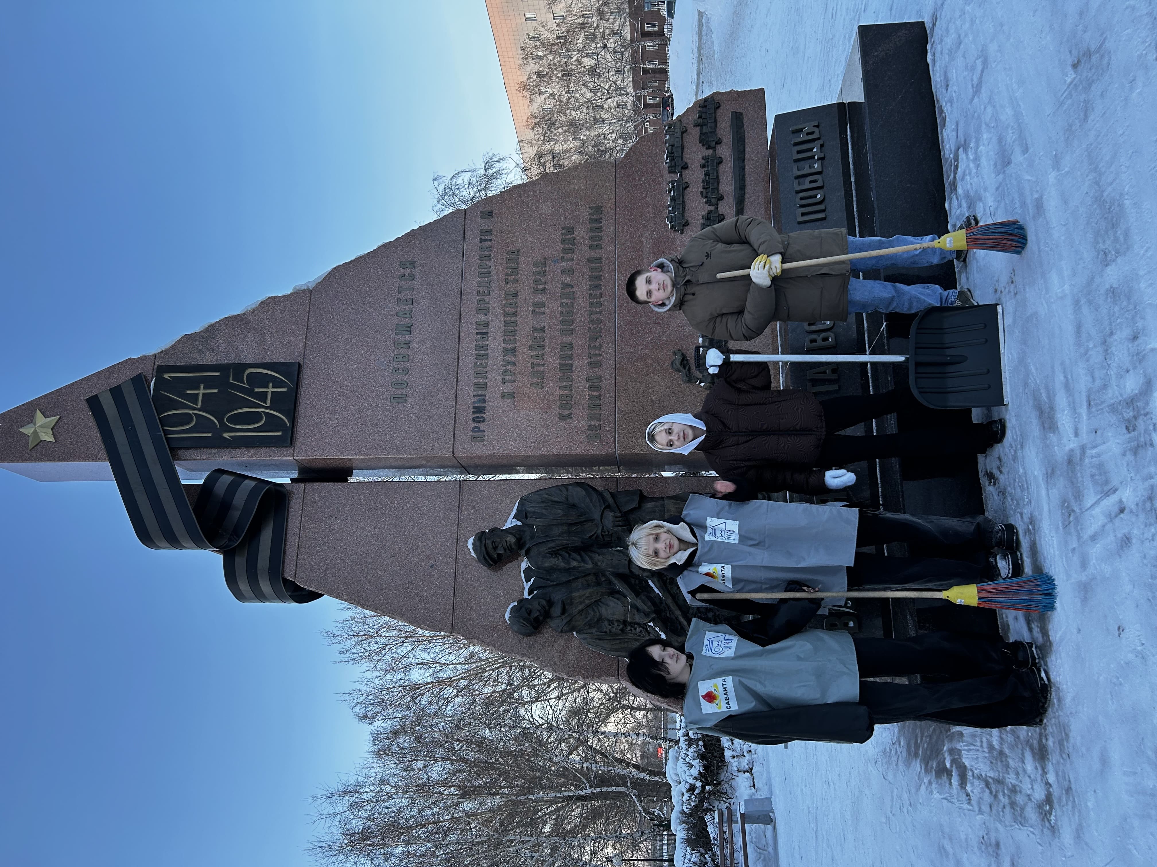 Ребята почистили от снега Стеллу эвакуированным заводам в годы Великой Отечественной войны и памятный знак в честь Алексея Ивановича Скурлатова, участника Великой Отечественной войны. После этого они поговорили о том, кто такой Алексей Иванович Скурлатов, отметив, что это наш земляк, который стал прототипом памятника «Алёша» в Болгарии. Также ребята прослушали легендарную песню "Алёша", вернувшись в общежитие.