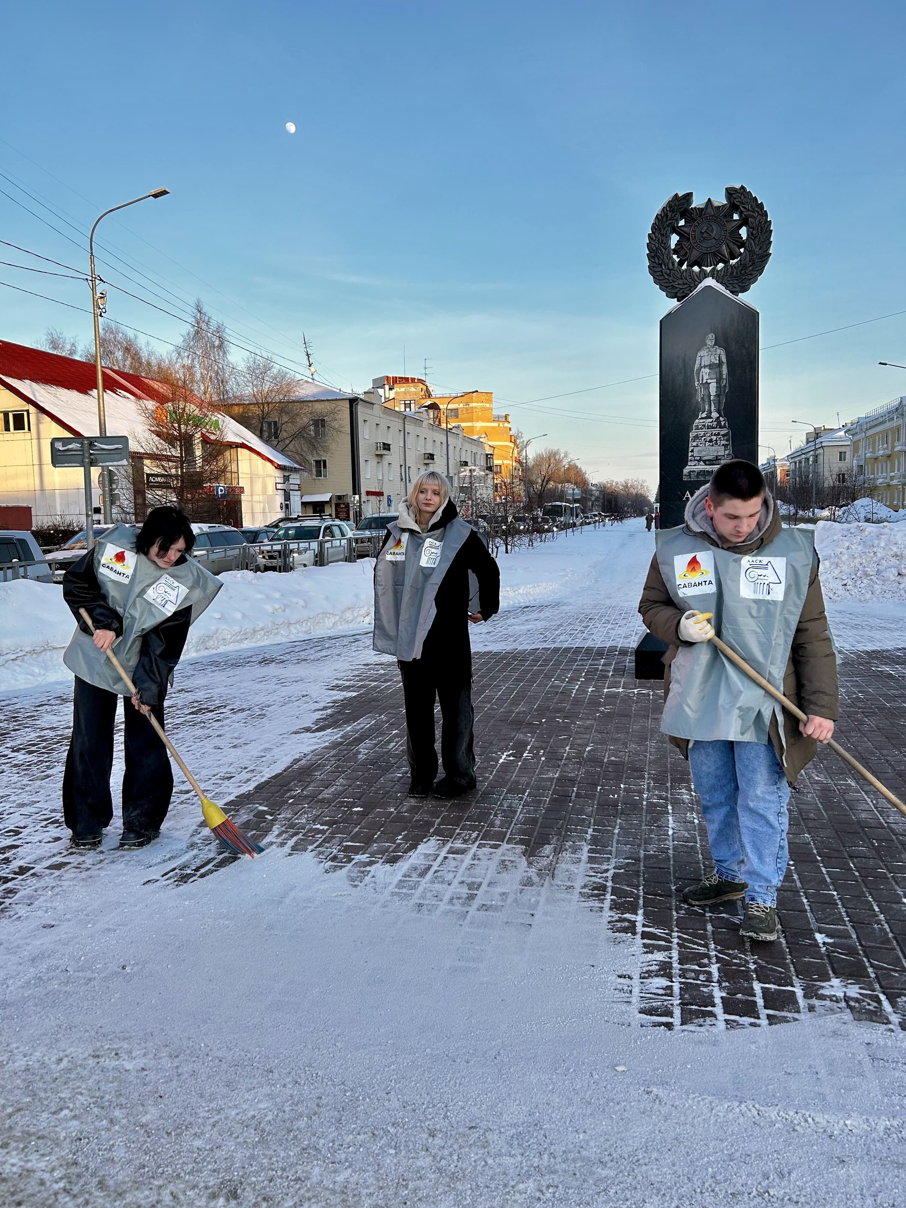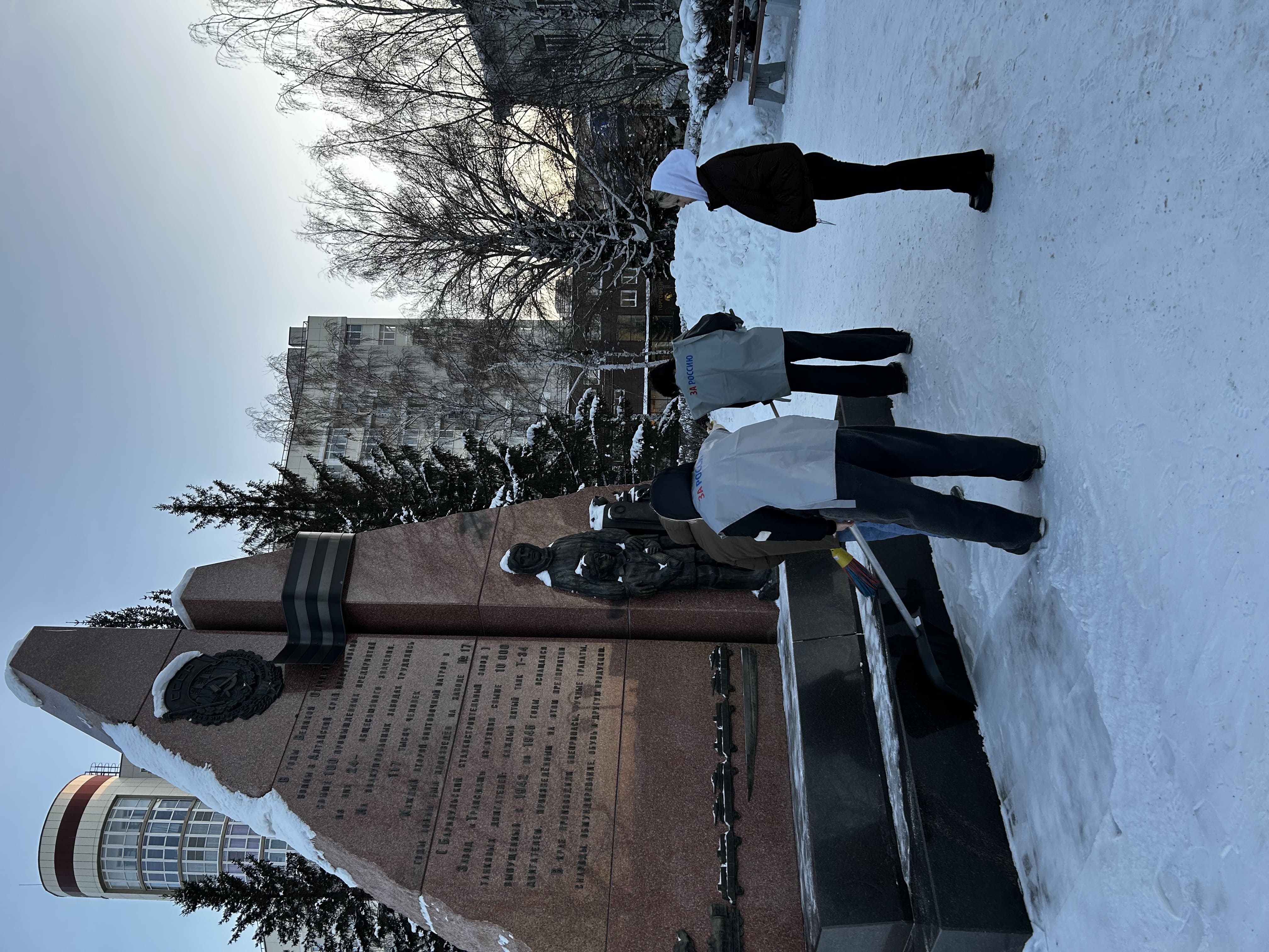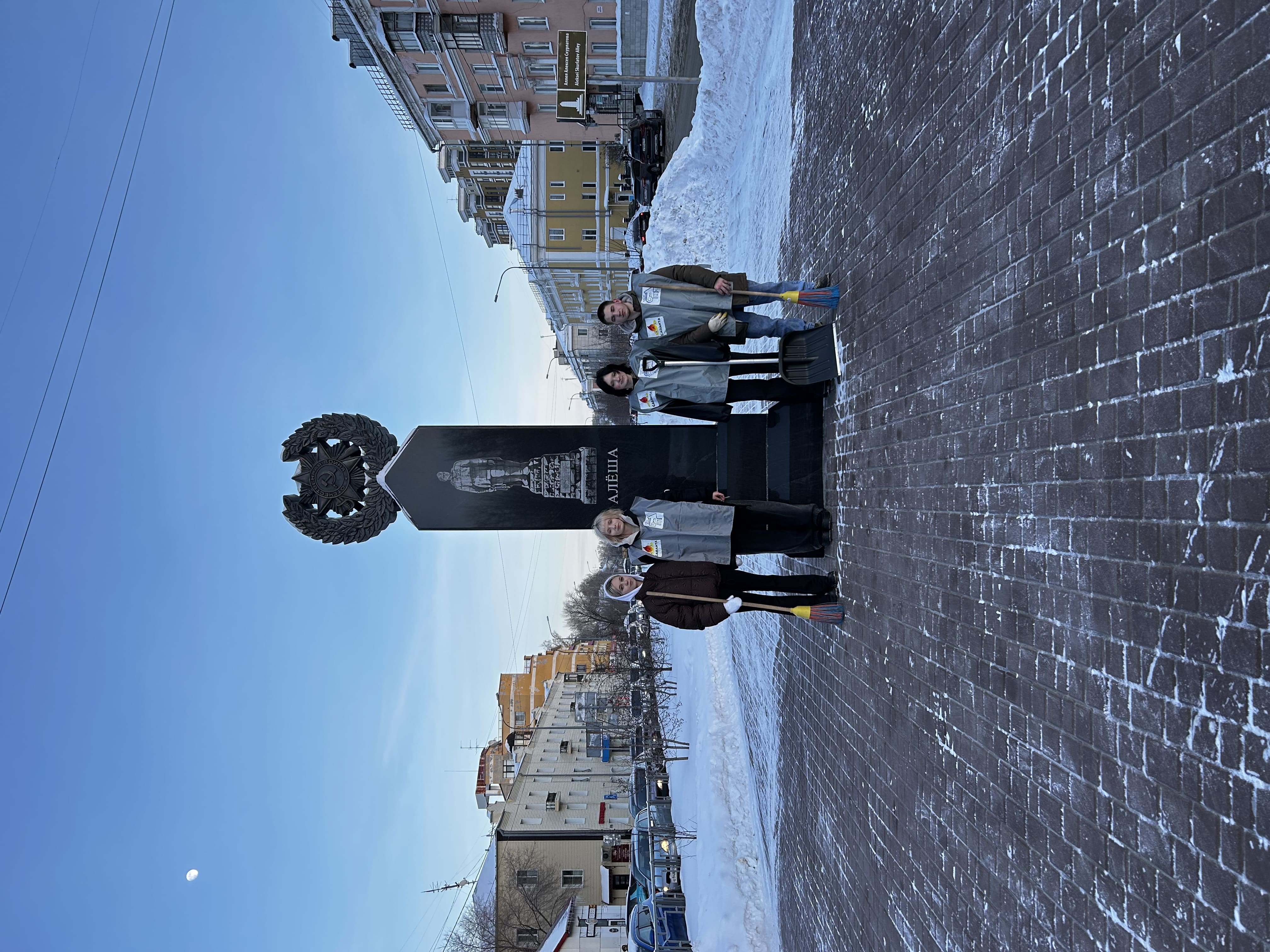 Ребята почистили от снега Стеллу эвакуированным заводам в годы Великой Отечественной войны и памятный знак в честь Алексея Ивановича Скурлатова, участника Великой Отечественной войны. После этого они поговорили о том, кто такой Алексей Иванович Скурлатов, отметив, что это наш земляк, который стал прототипом памятника «Алёша» в Болгарии. Также ребята прослушали легендарную песню "Алёша", вернувшись в общежитие.