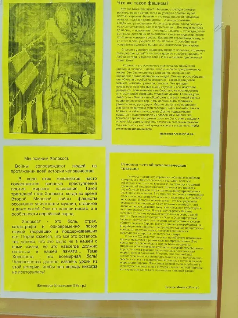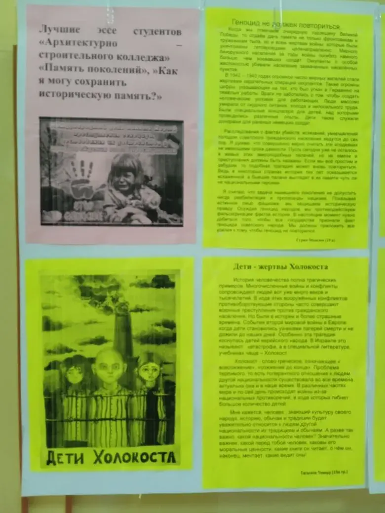 Студенты поделились своими мыслями и выразили их в форме эссе. Лучшие работы помещены на стендах колледжа (Гурин М., Тагызов Т., Молодоря А., Зудилов М., Жолнеров В., Казанцев А., Либерт К., Фишер И., Загороднев М.), Впоследствии работы будут направлены на конкурсы разного уровня.
