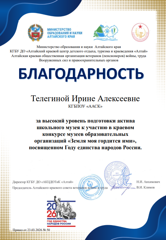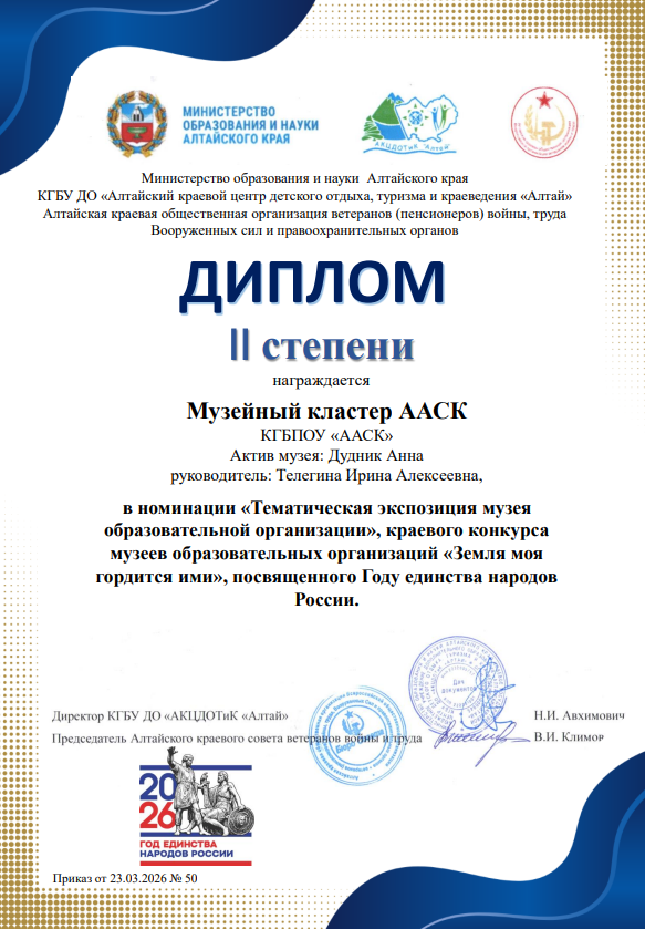 В Алтайском крае в рамках государственного задания прошёл краевой конкурс «Земля моя гордится ими», посвящённый Году единства народов России. Конкурс стал региональным этапом Всероссийского конкурса музеев образовательных организаций РФ в 2026 году.