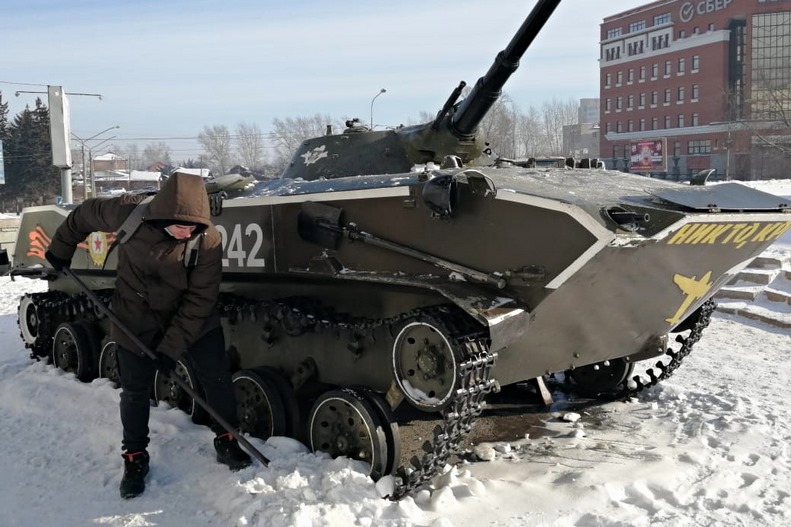 Для выполнения работ нашим ребятам была определена площадь Ветеранов. В ходе акции от снега и наледи были очищены танк «Т-62а» и боевая машина десанта, а также прилегающая к ним территория.
