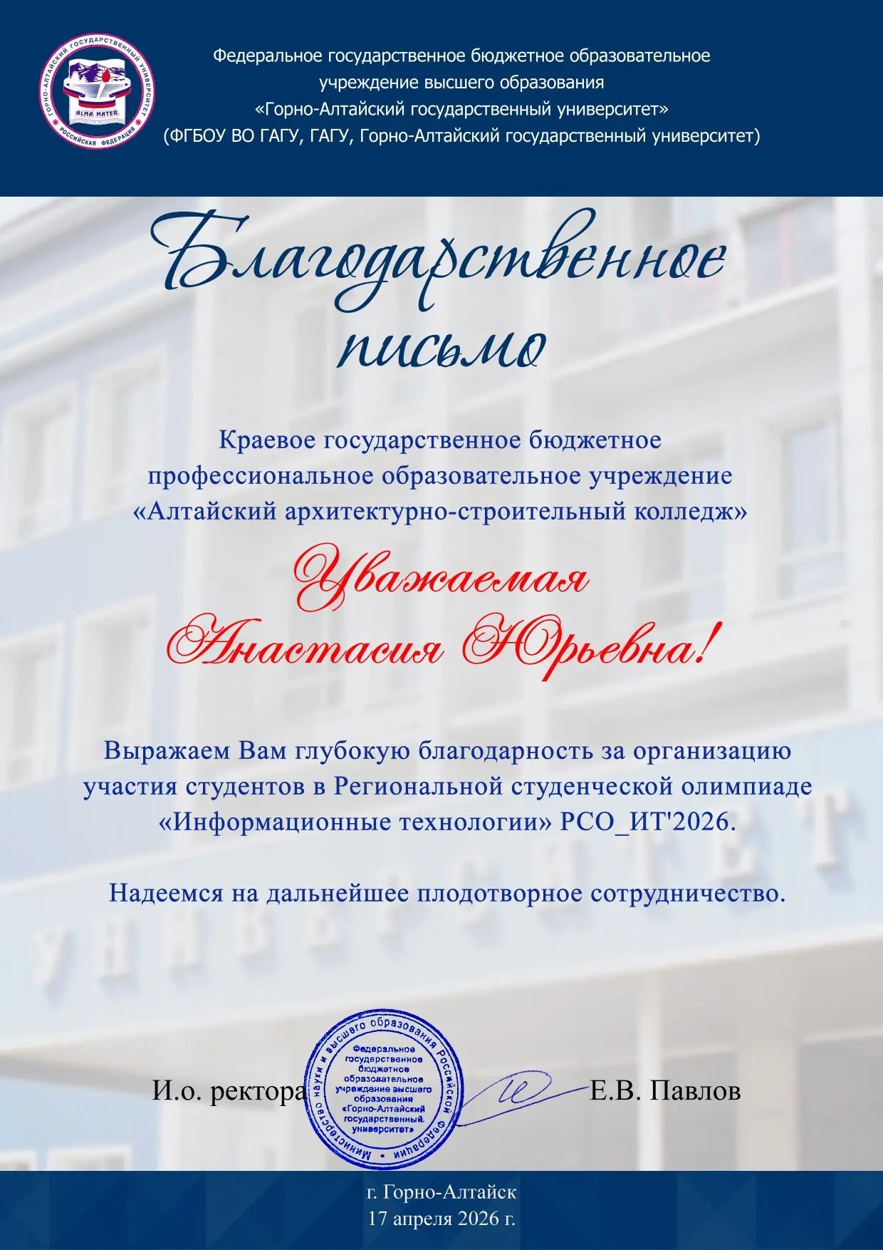 Студент Алтайского архитектурно-строительного колледжа Балуев Сергей продемонстрировал высокий уровень профессиональной подготовки на Региональной студенческой олимпиаде «Информационные технологии» РСО_ИТ'26, завоевав почётное третье место.