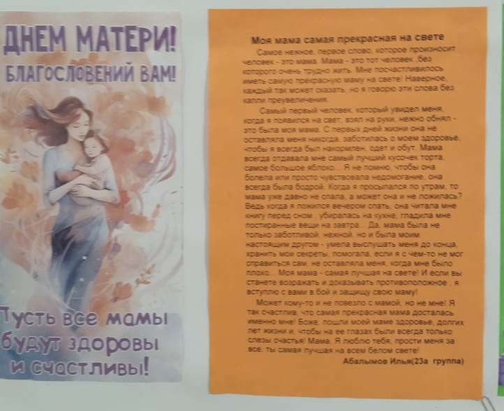 Накануне Дня матери в рамках работы ПЦК гуманитарных дисциплин прошел конкурс сочинений о мамах, его провели преподаватели русского языка и литературы Демченко И.А. и Абоимова С.А. Конкурс сочинений ко Дню Матери — это прекрасный способ дать подросткам выразить свою любовь и благодарность.