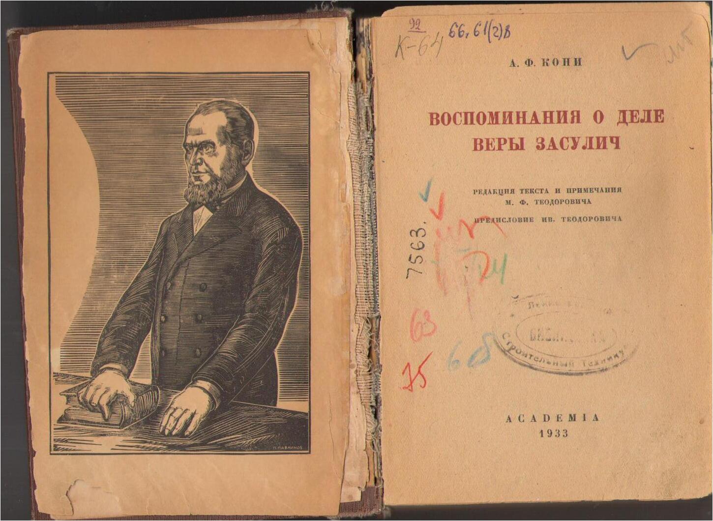 Книга «Воспоминания о деле Веры Засулич» написана Анатолием Федоровичем Кони, русским юристом, общественным деятелем, литератором, по дневникам, которые он вел с 1868 года. Широкую известность А.Ф. Кони приобрел в связи с делом В.И. Засулич, обвинявшейся в покушении на убийство петербургского градоначальника генерала Ф.Ф. Трепова. Рукопись этой книги А.Ф. Кони передал в 1920 году Академии Наук, чтобы она увидела свет после его смерти. Эта книга и сейчас читается с большим интересом, так как написана хорошим литературным языком, достоверна, содержит документы и фотографии, которые опубликованы впервые.