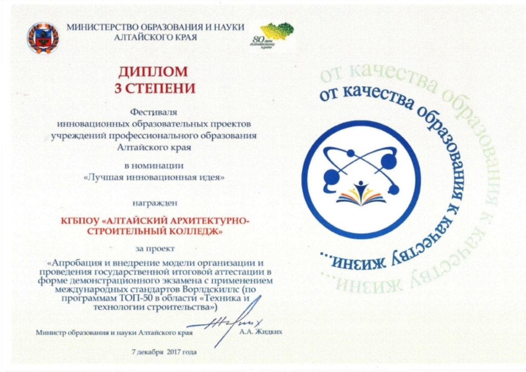 В номинации «Лучшая инновационная идея» КГБПОУ «Алтайский архитектурно-строительный колледж» в лице зав. МФЦПК Белгородцевой М.М. представил проект «Апробация и внедрение модели организации и проведения государственной итоговой аттестации в форме демонстрационного экзамена с применением международных стандартов Ворлдскиллс».