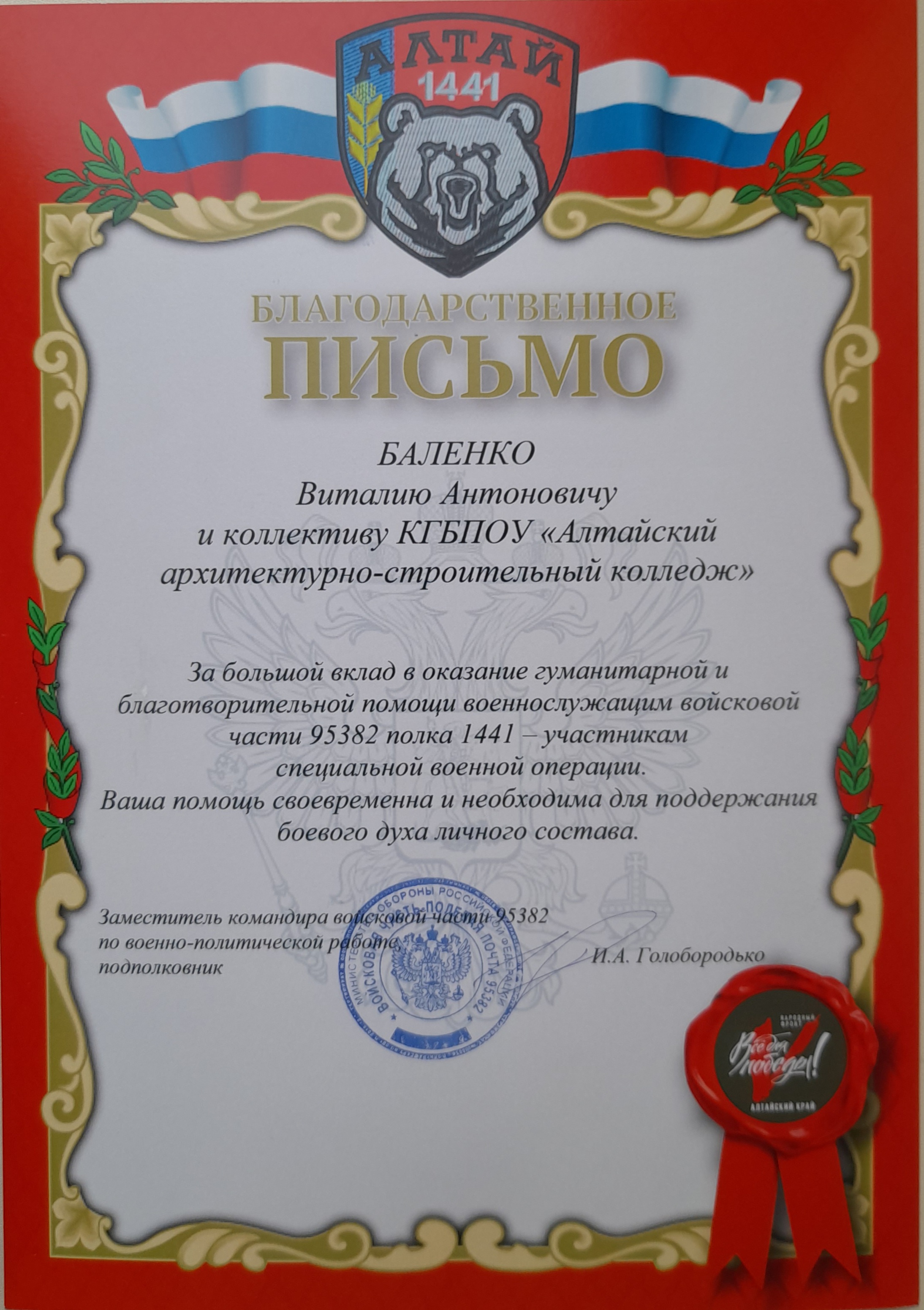С первых дней начала СВО Алтайский архитектурно – строительный колледж принимал активное участие в поддержке наших военнослужащих войсковой части 95382 полка 1441 – участников специальной военной операции. За вклад в оказании гуманитарной и благотворительной помощи заместитель командира войсковой части 95382 по военной политической работе подполковник И.А.Голобородько выразил благодарность директору колледжа Виталию Антоновичу Баленко и коллективу КГБПОУ «Алтайский архитектурно-строительный колледж».