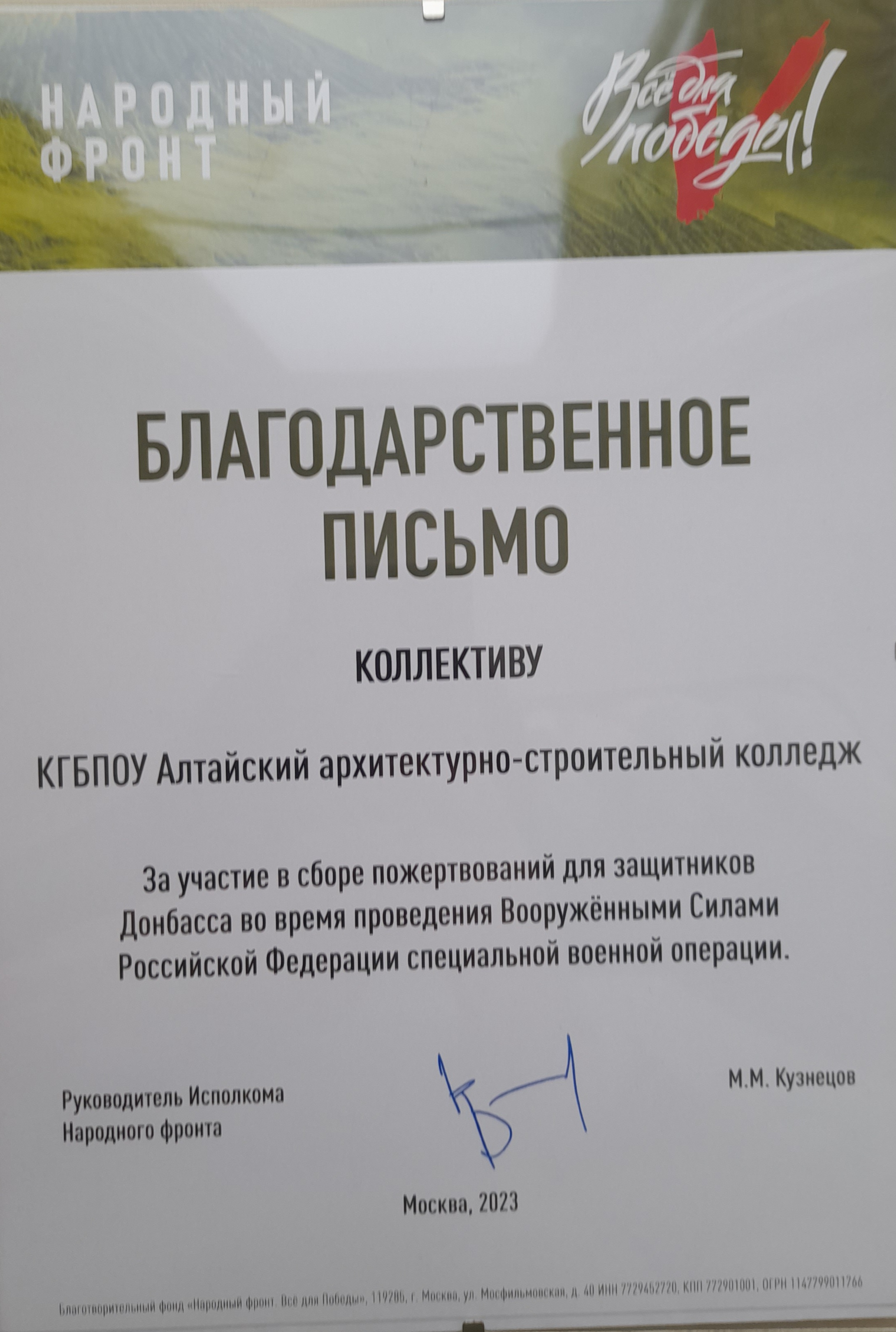 Благодарственным письмом от руководителя Исполкома Народного фронта М.Н.Кузнецова г.Москва в 2023 году отмечен коллектив КГБПОУ «Алтайский архитектурно-строительный колледж» за участие в сборе пожертвования для защитников Донбасса во время проведения Вооружёнными Силами Российской Федерации специальной военной операции.