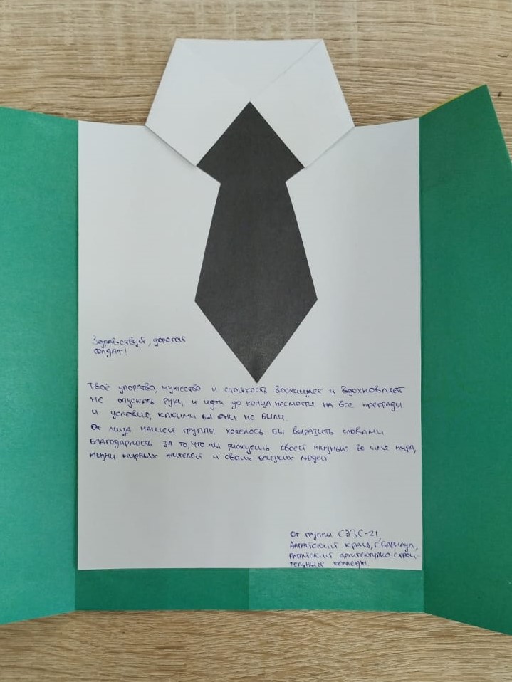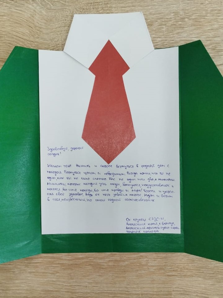 классного руководителя Сатюковой Ж.Э. подготовили в адрес военнослужащих участников специальной военной операции открытки со словами благодарности и пожелания скорейшего возвращения домой с Победой.