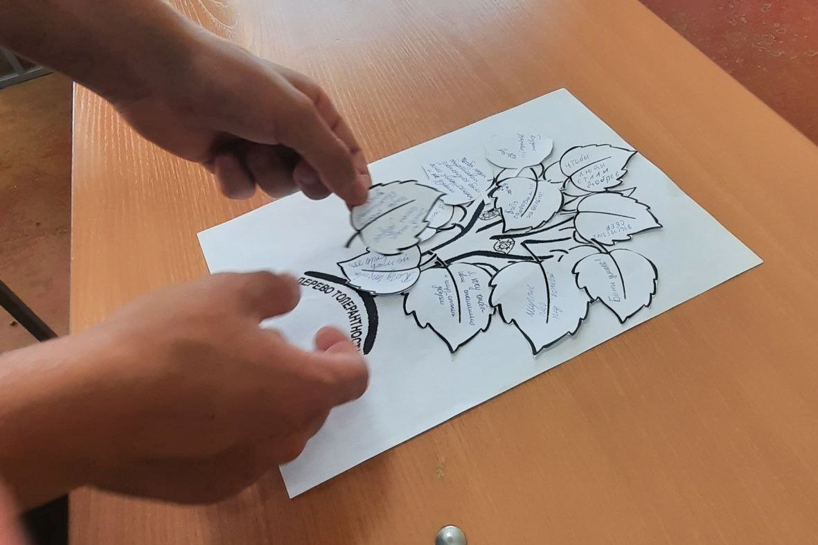Обучающимся было предложено посадить «Дерево толерантности». На шаблонах в форме листьев ребята написали свое мнение, что необходимо сделать, чтобы группа, колледж стали лучшими «Пространствами толерантности», затем эти листья приклеили к изображению дерева толерантности.