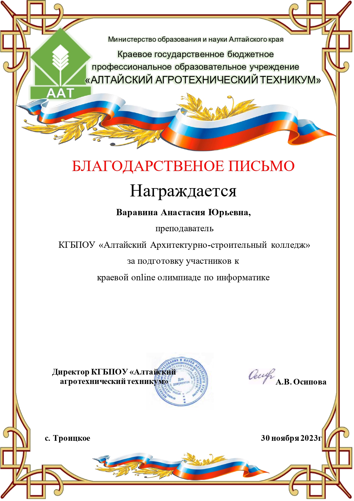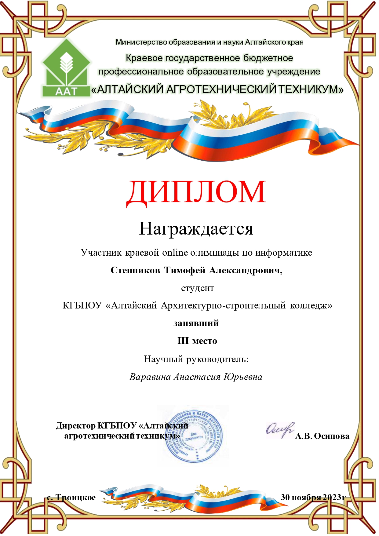 30 ноября 2023 студенты группы ИСИП-21 приняли участие в Краевой online олимпиаде по информатике от КГБПОУ «Алтайский агротехнический техникум»