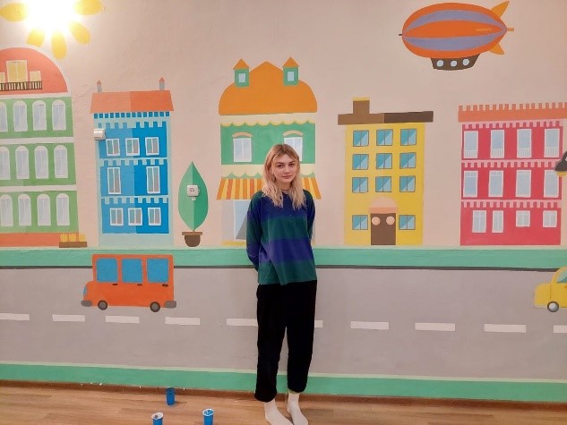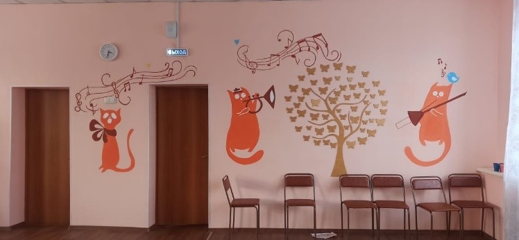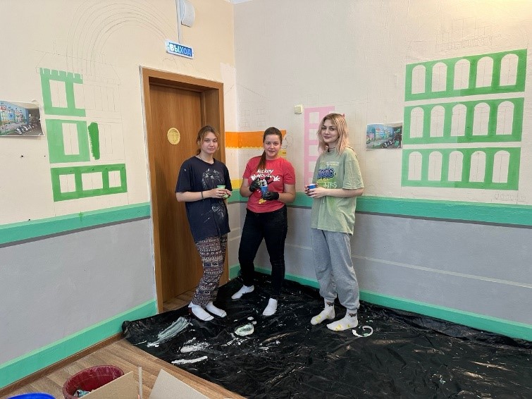 Парыгина Мария, Лагочёва Александра и Толстова Арина, студентки 2 курса украсили музыкальный зал детского сада настенной росписью и оформили комнату правил дорожного движения. Девочки работали в современной технике – роспись акрилом.