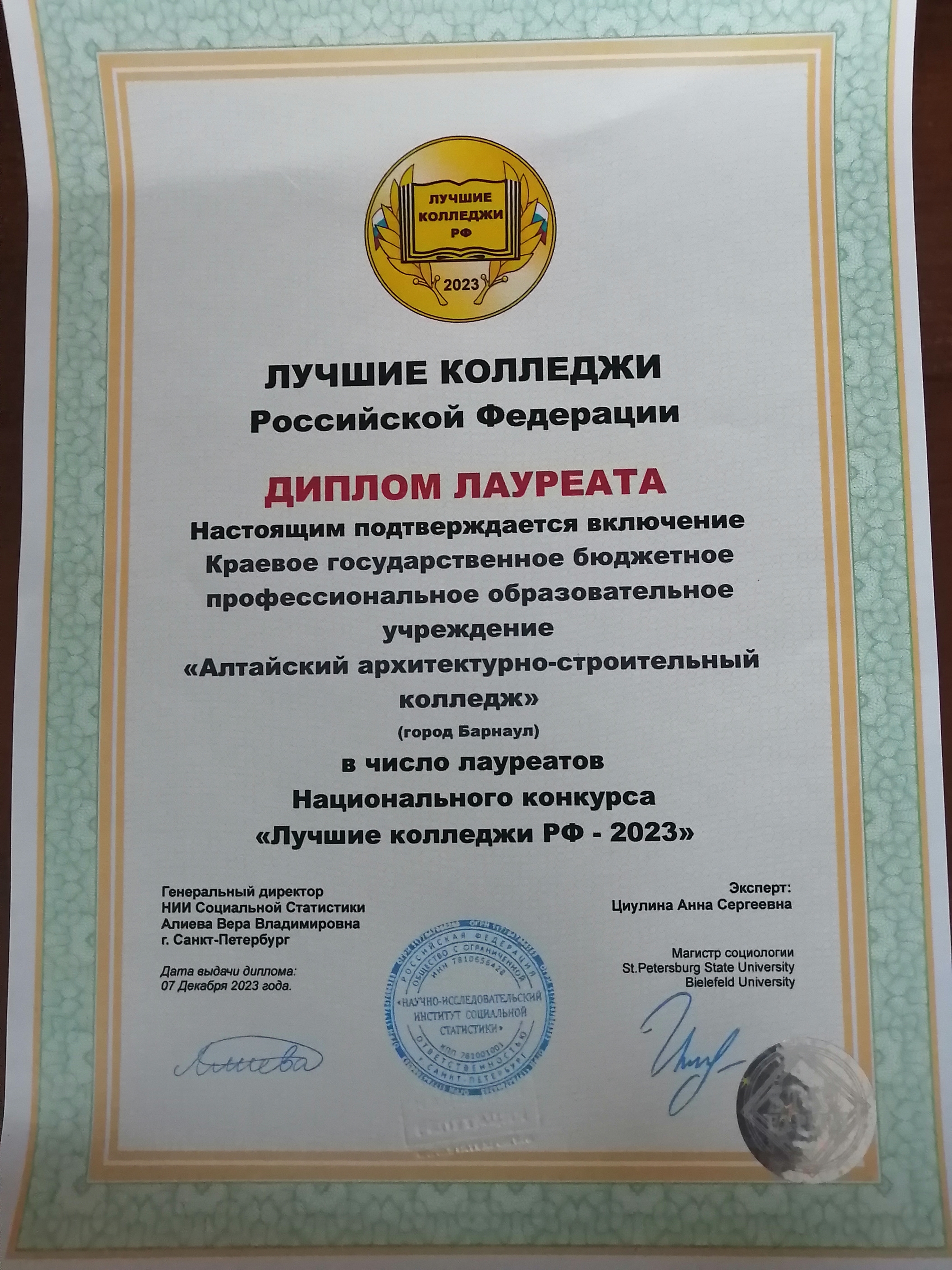 Алтайский архитектурно-строительный колледж стал лауреатом национального конкурса «Лучшие колледжи РФ» в 2023 году. Это подтверждается данными Научно-исследовательского института социальной статистики (НИИСС).