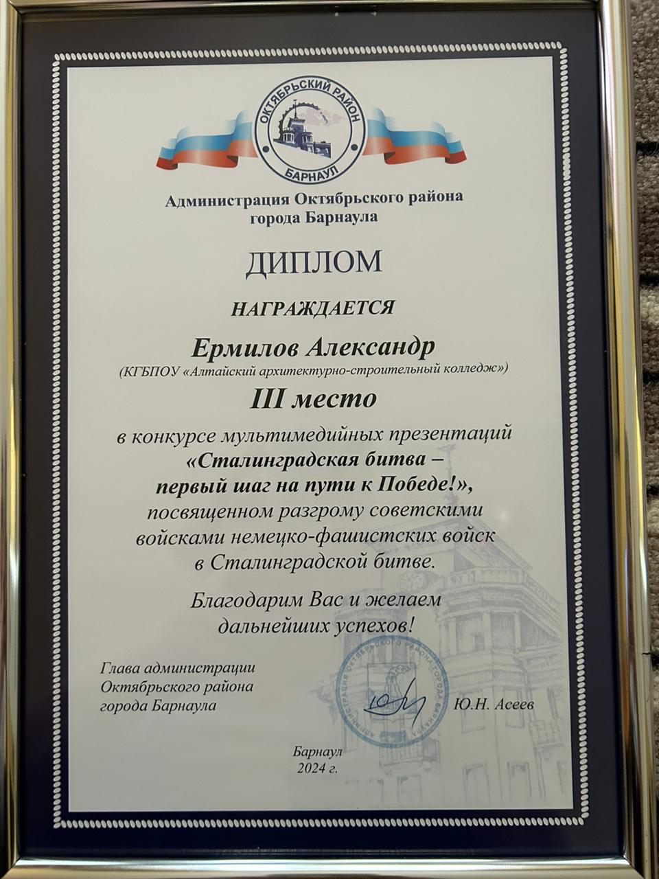 02.02.2024 на Барнаульском Станкостроительном заводе состоялось награждение победителей районного конкурса мультимедийных презентаций «Сталинградская битва – первый шаг на пути к Победе!», посвященного разгрому советскими войсками немецко – фашистских войск в Сталинградской битве.