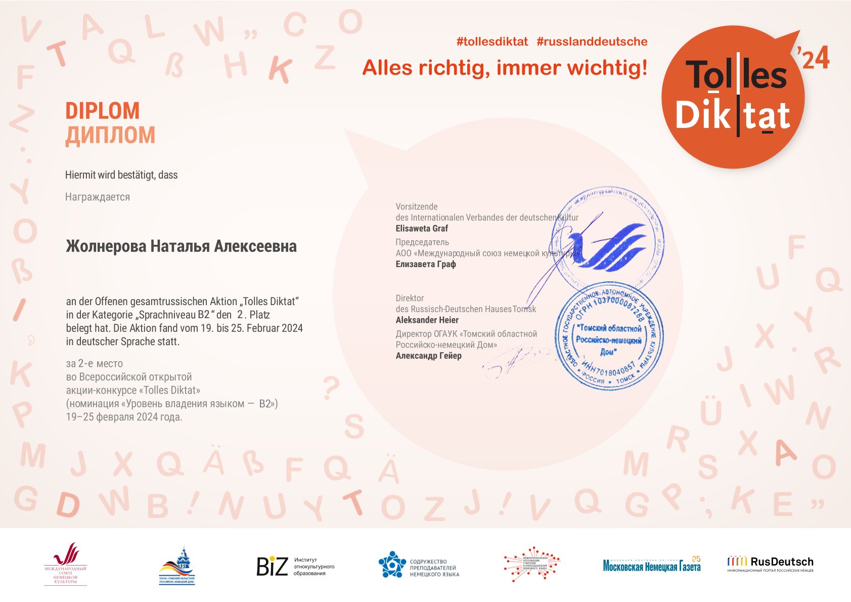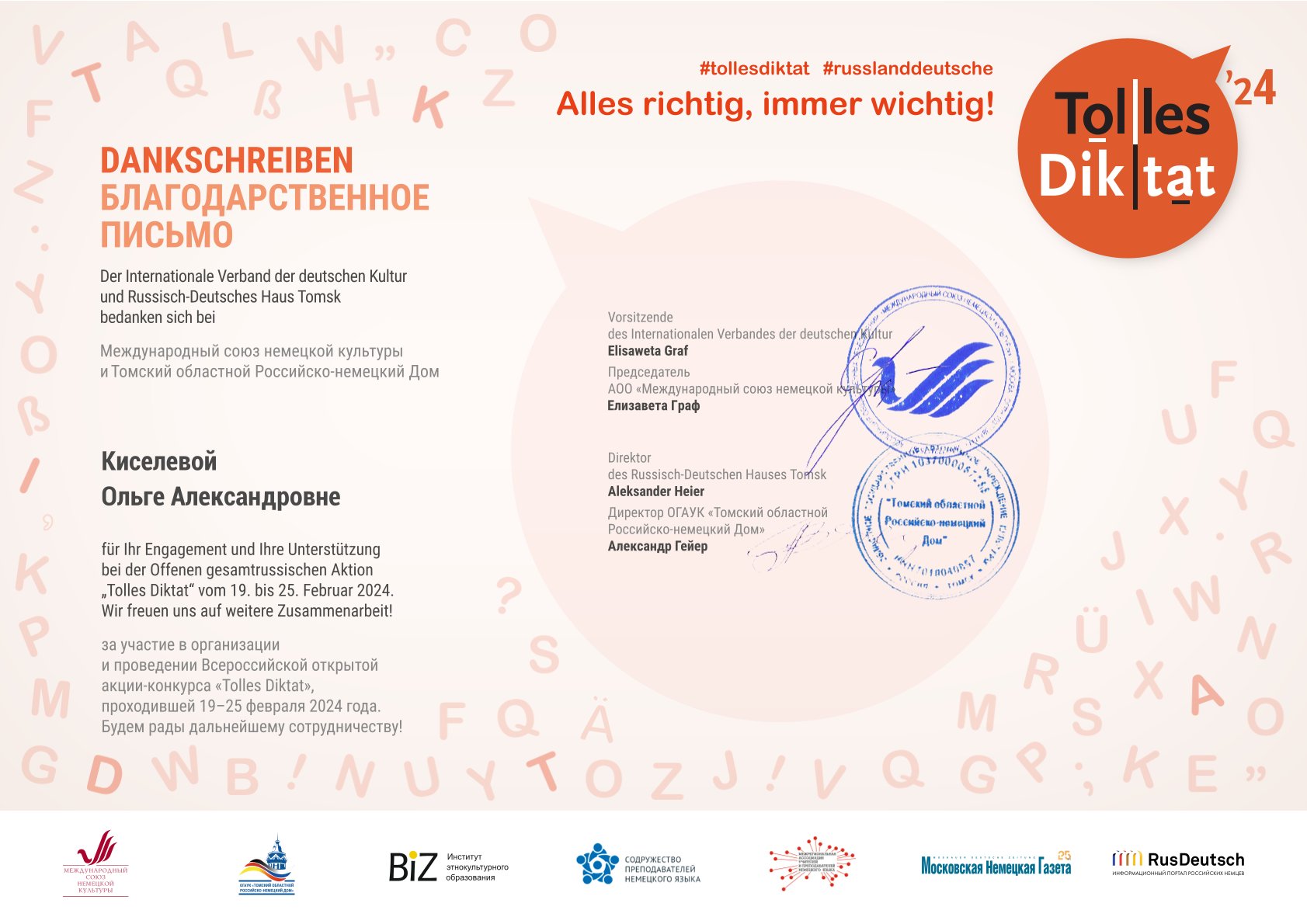 С 19 по 25 февраля 2024 года в 12-й раз прошла Всероссийская открытая акция «Tolles Diktat» по инициативе общественных организаций российских немцев с целью популяризации немецкого языка и развития культуры грамотного письма на немецком языке.