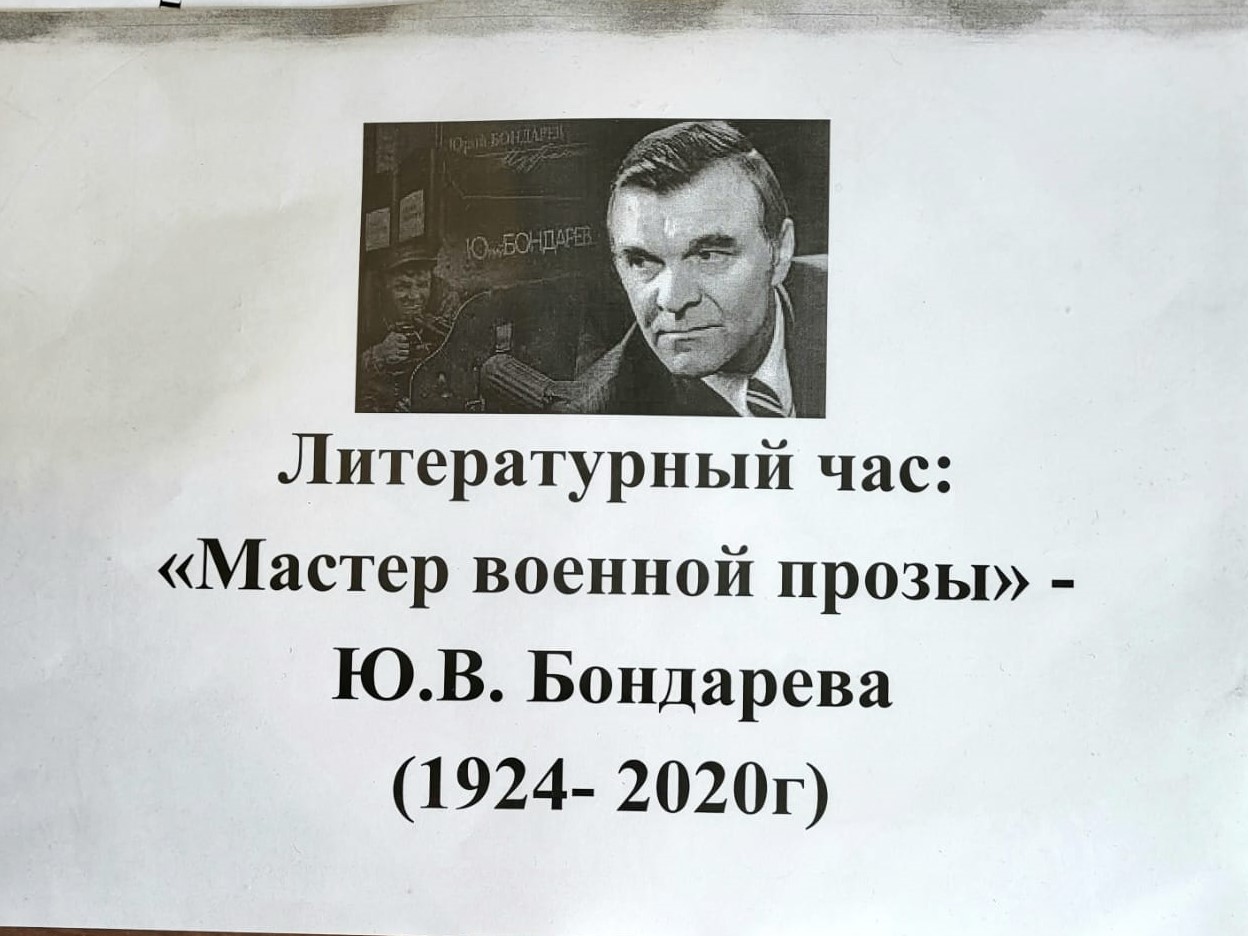 20 марта студенты 16 группы ААСК вспоминали личность Юрия Васильевича Бондарева - русского писателя и сценариста. К его 100-летию классным руководителем Абоимовой С.А. и библиотекарем Четвериковой Т.А. был проведён литературный классный час  "Мастер военной прозы - Бондарев".