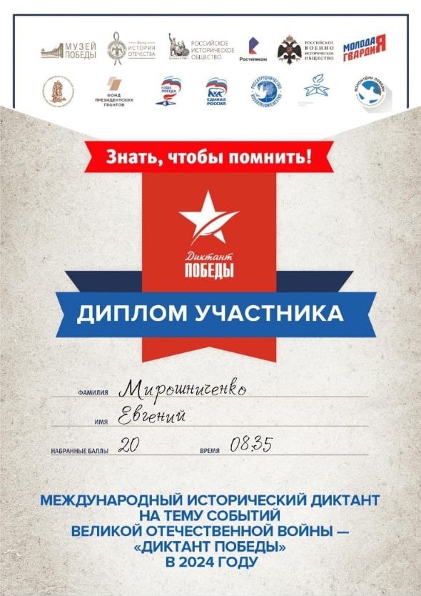 Студенты колледжа поучаствовали в международной исторической акции «Диктант Победы» - 2024, показав неплохие результаты.  Особую благодарность хотелось бы выразить самым активным классным руководителям Похожаловой Ю.В., Киселевой О.А., Богатыренко И.А., Савченко О.Г., Антоненковой Е.А., Куприковой И.Н.