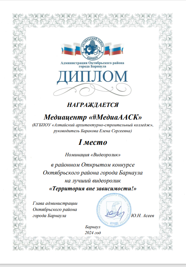 Команда медиацентра колледжа #МедиаААСК приняли участие в конкурсе Октябрьского района города Барнаула на лучший видеоролик «Территория вне зависимости».