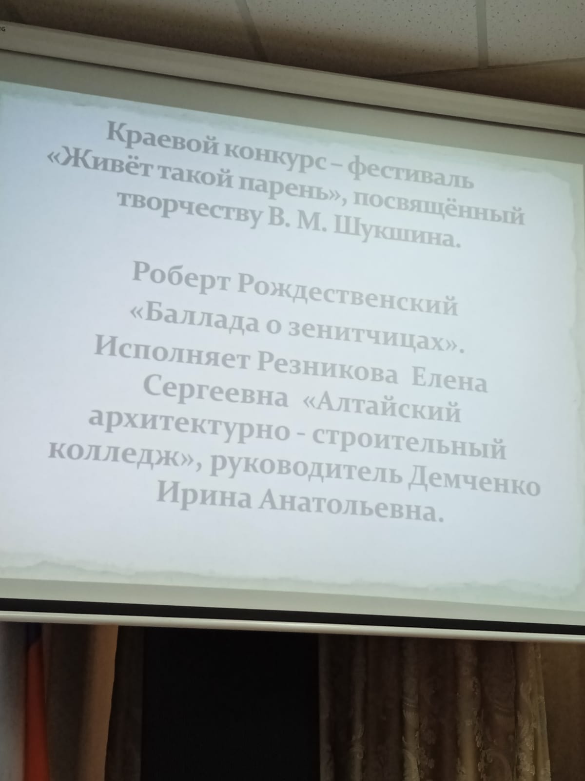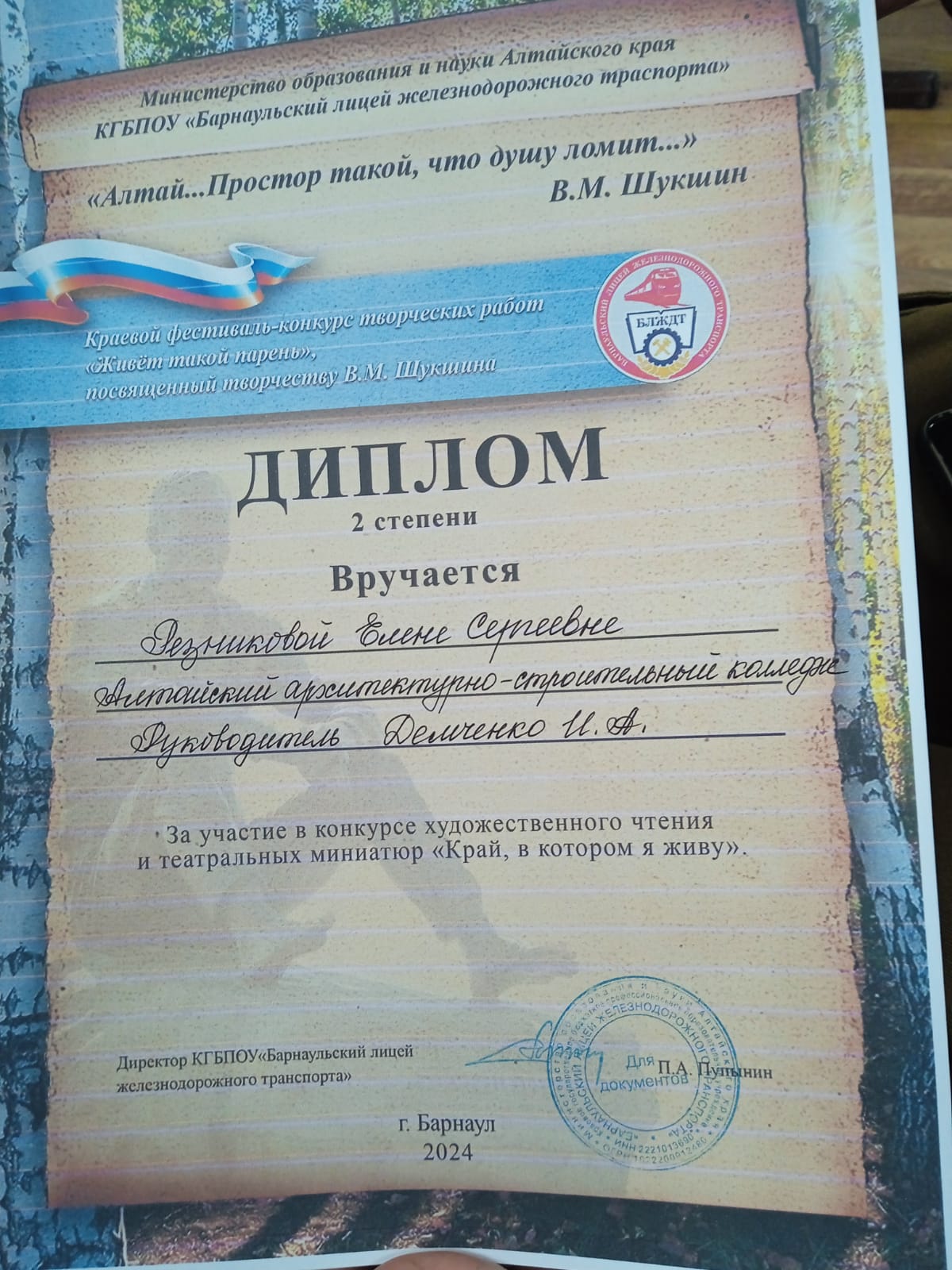 2 октября в Барнаульском лицее железнодорожного транспорта прошёл Краевой фестиваль-конкурс творческих работ "Живёт такой парень", посвящённый творчеству В. М. Шукшина.