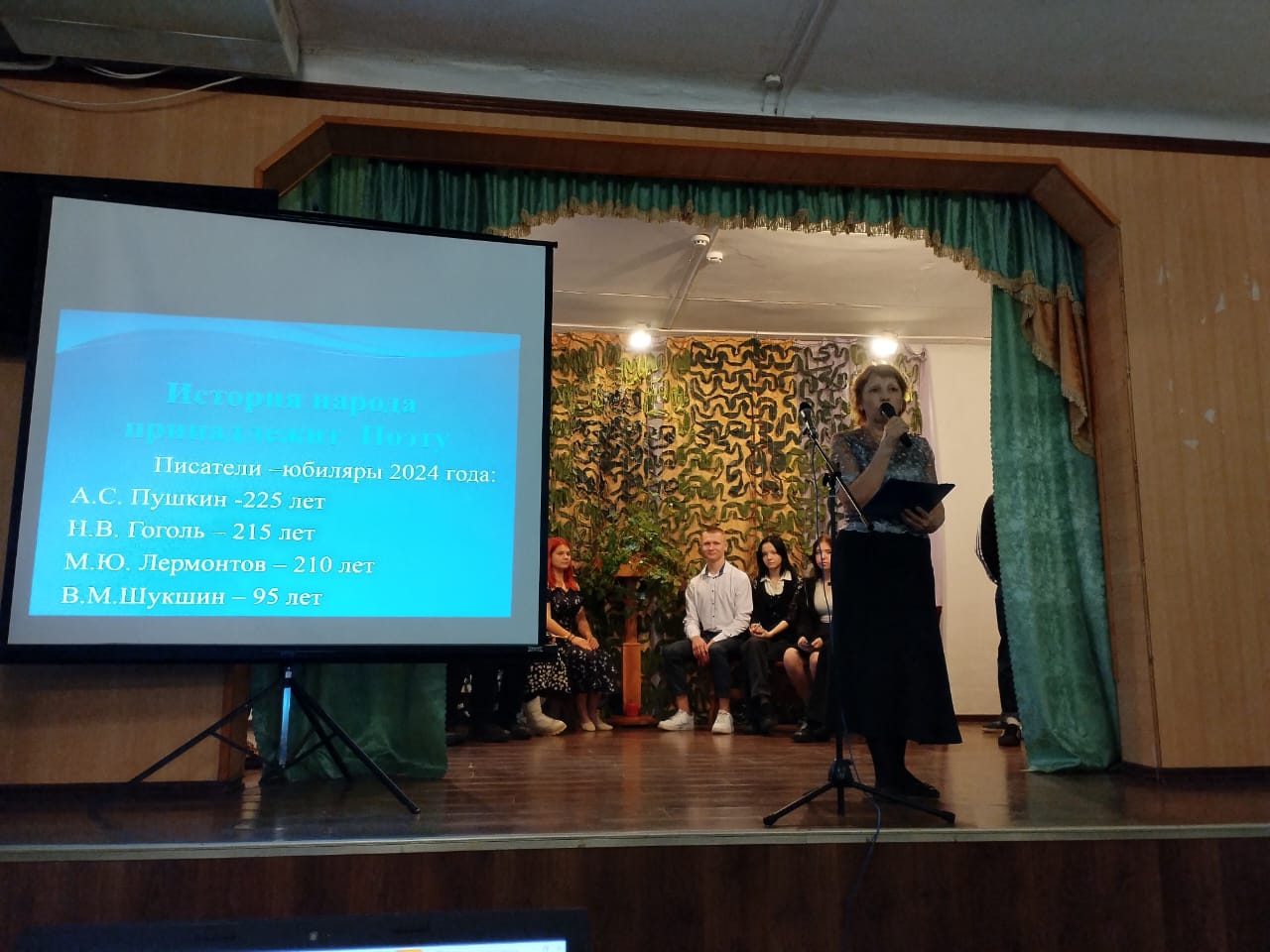 В 2024 году  исполнилось  225 лет со дня рождения  Александра Сергеевича Пушкина, 215 лет со дня рождения Николая Васильевича Гоголя, 210 лет со дня рождения Михаила Юрьевича Лермонтова, 95 лет со дня рождения  Василия Макаровича Шукшина.  Этим замечательным художникам слова, классикам русской литературы  и была посвящена литературная гостиная. Мероприятие подготовили преподаватели русского языка и литературы Тимофеева Н.Б., Демченко И.А. совместно с советником по воспитанию Фефеловой Т.Н.