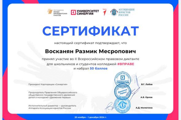 С целью укрепления в сознании молодёжи уважения к закону и развития гражданской ответственности. Студентам колледжа было предложено принять участие во Всероссийском правовом диктанте для школьников и студентов #ВПРАВЕ. Диктант проводится при поддержке Министерства просвещения Российской Федерации, Фонда Президентских грантов Российское движение детей и молодёжи «Движение первых» совместно с ассоциацией юристов России и университета «Синергия».