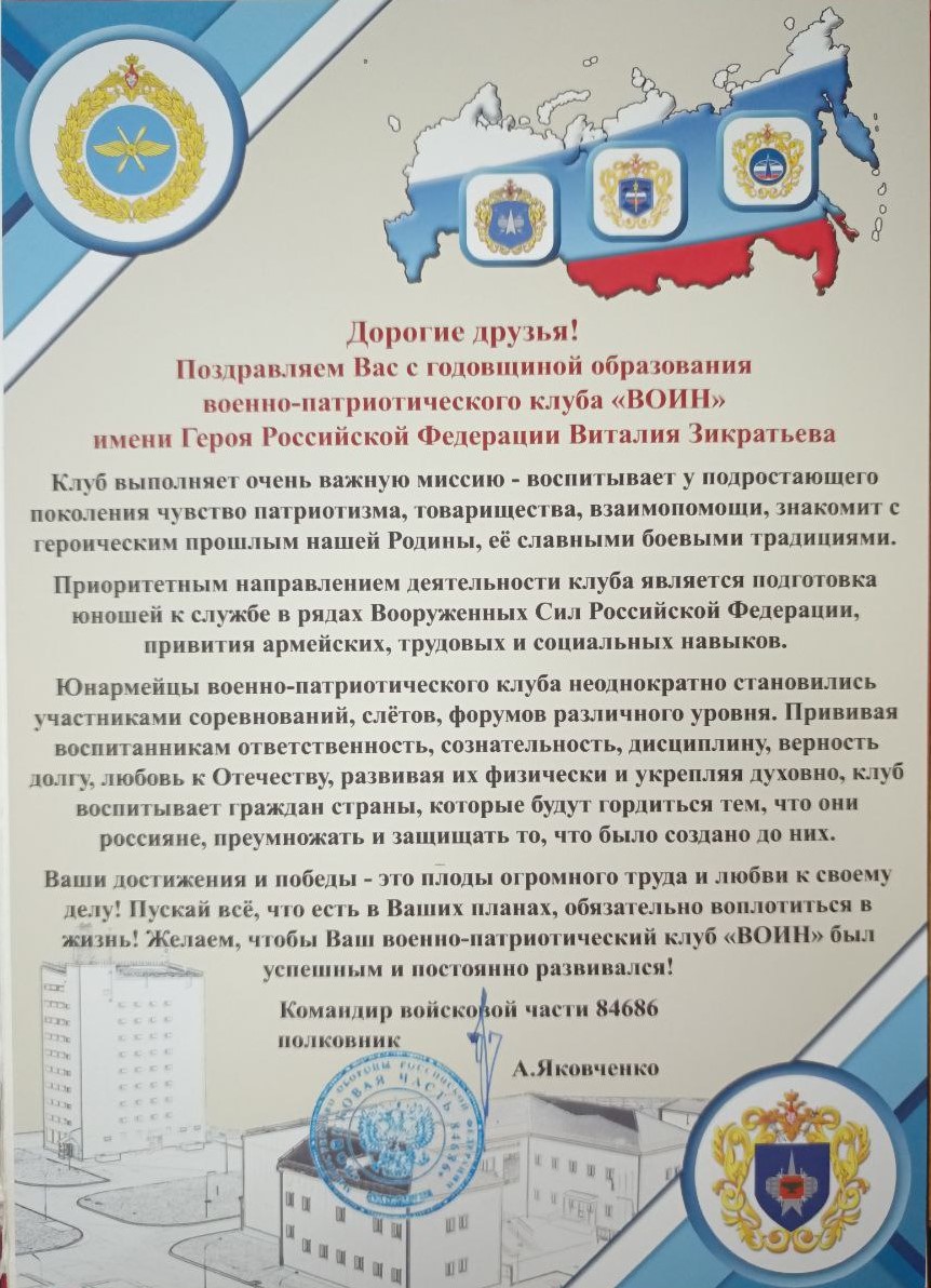 ВПК «ВОИН» имени Героя Российской Федерации Зикратьева В.В. исполнилось 4 года. Нам есть чем гордиться и кем гордиться. Сегодня выпускники клуба достойно выполняют свой гражданский долг, проходя службу в рядах Вооруженных Сил России.