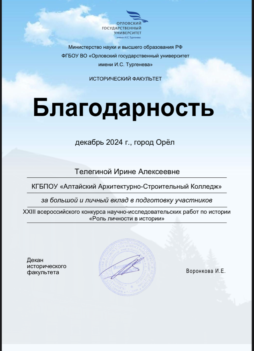 Вклад в мировую историю лиц разных национальностей и конфессий позволяет сохранить эту историческую память ежегодный конкурс научно- исследовательских работ "Роль личности в истории», проводимый на базе исторического факультета ФГБОУ ВО «Орловский государственный университет имени И.С. Тургенева».