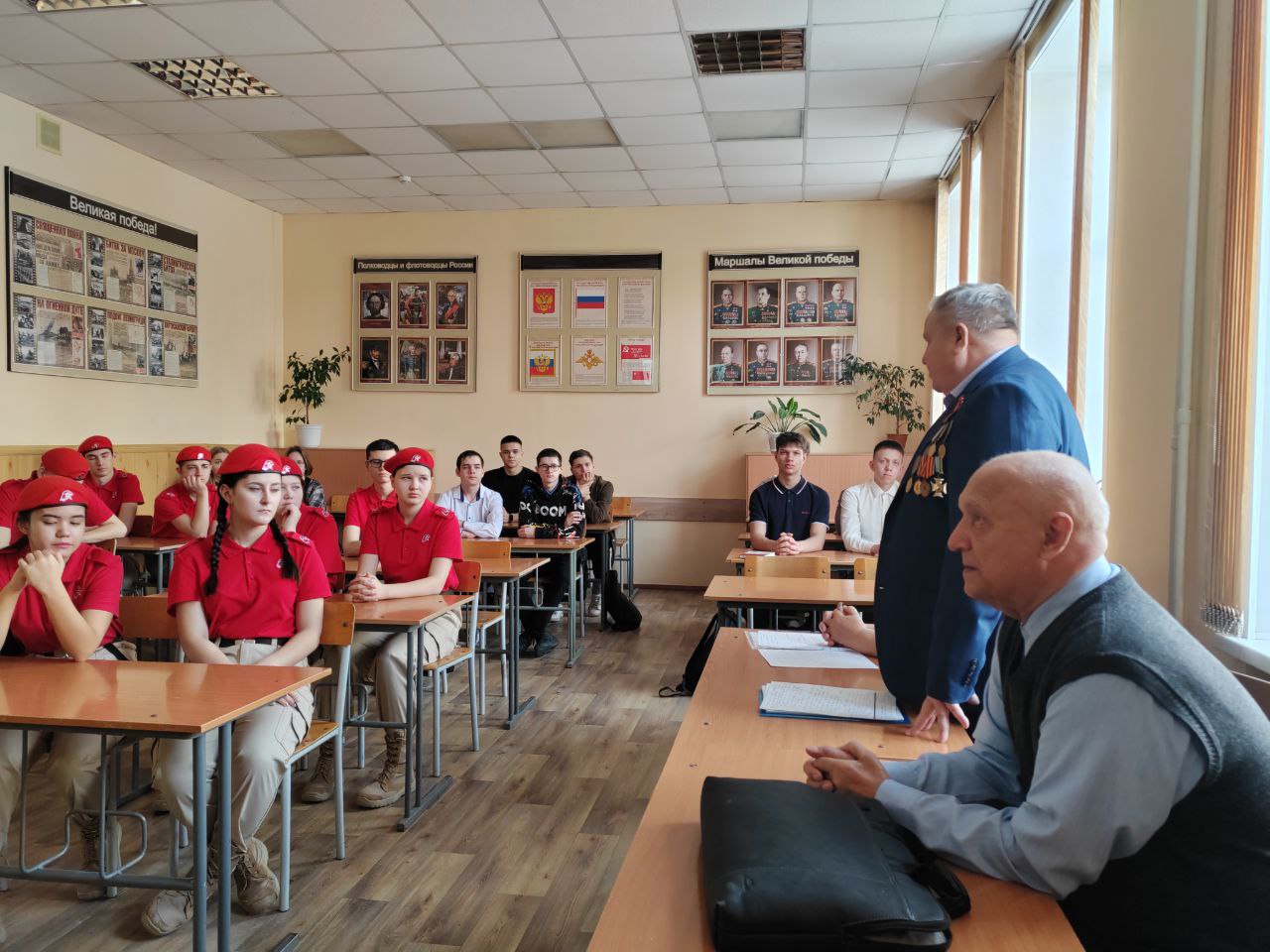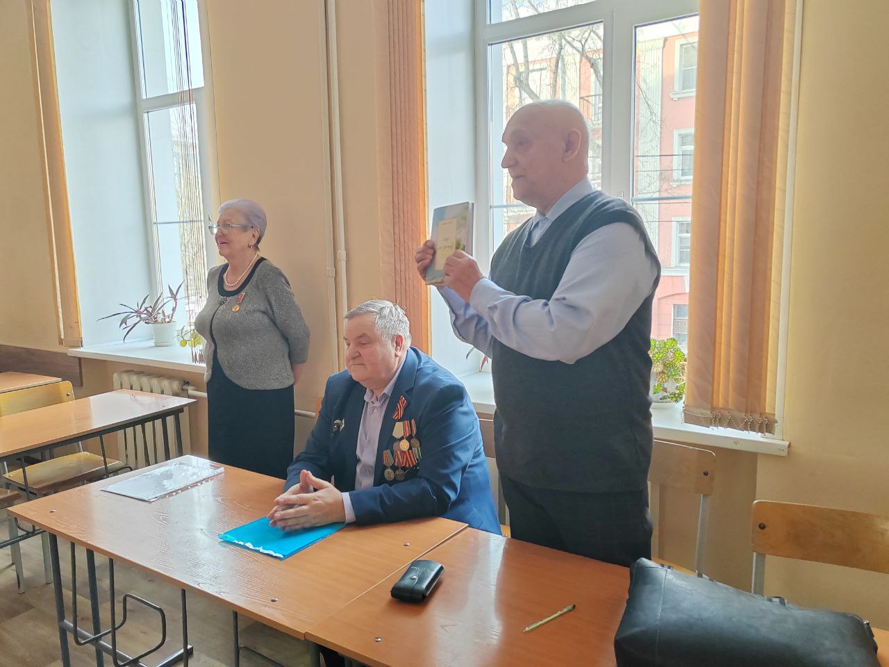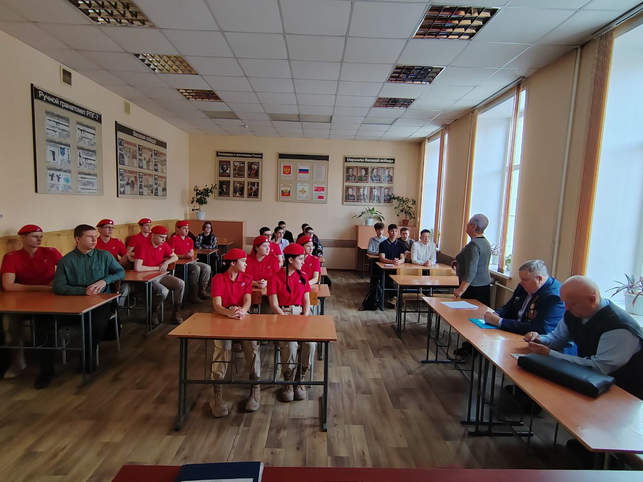 На встречу к студентам пришли Солодкая Татьяна Ивановна, председатель комитета ветеранов Центрального района г. Барнаула, Скорых Михаил Леонидович, заместитель председателя комитета ветеранов Центрального района г. Барнаула, Садков Василий Васильевич, ветеран военной службы.