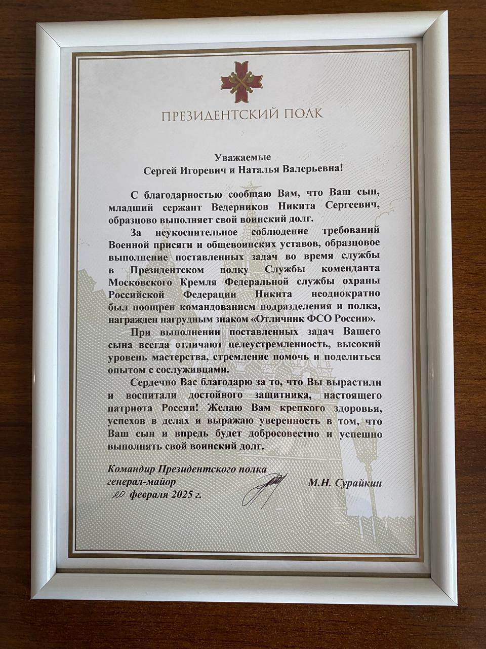 Мама Никиты Ведерникова, Наталья Валерьевна, сообщила, что сыну будет передано знамя Президентского полка для написания напутствий и пожеланий в память о службе. Первым автограф оставил Вячеслав Франк: «Никита! Мы тебя ждем».