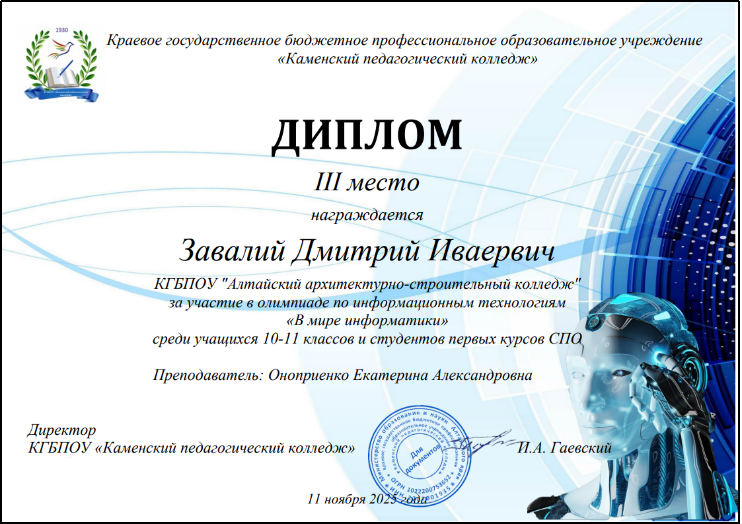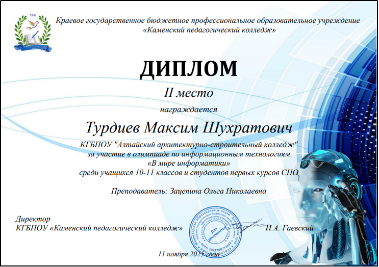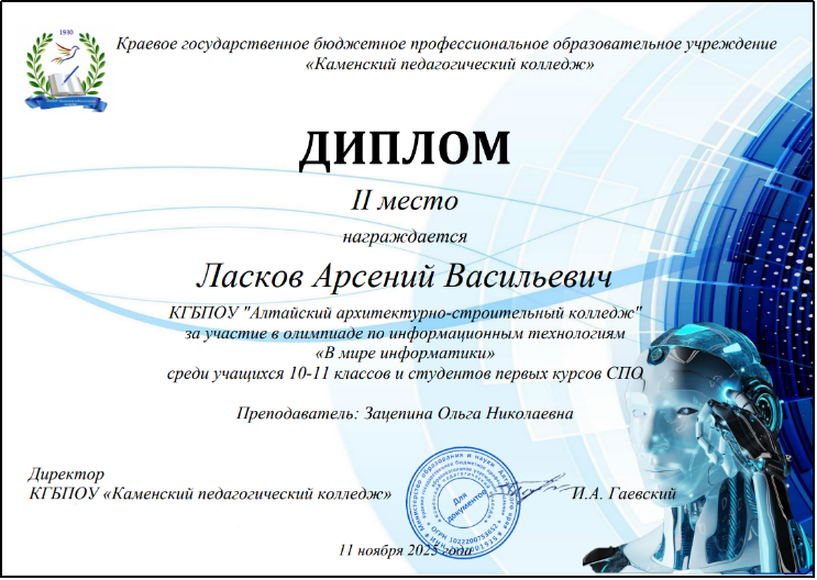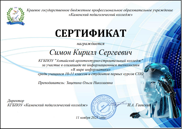 11 ноября прошла Краевая олимпиада по информационным технологиям «В мире информатики» на площадке онлайн обучения КГБОУ ПОУ "Каменский педагогический колледж".