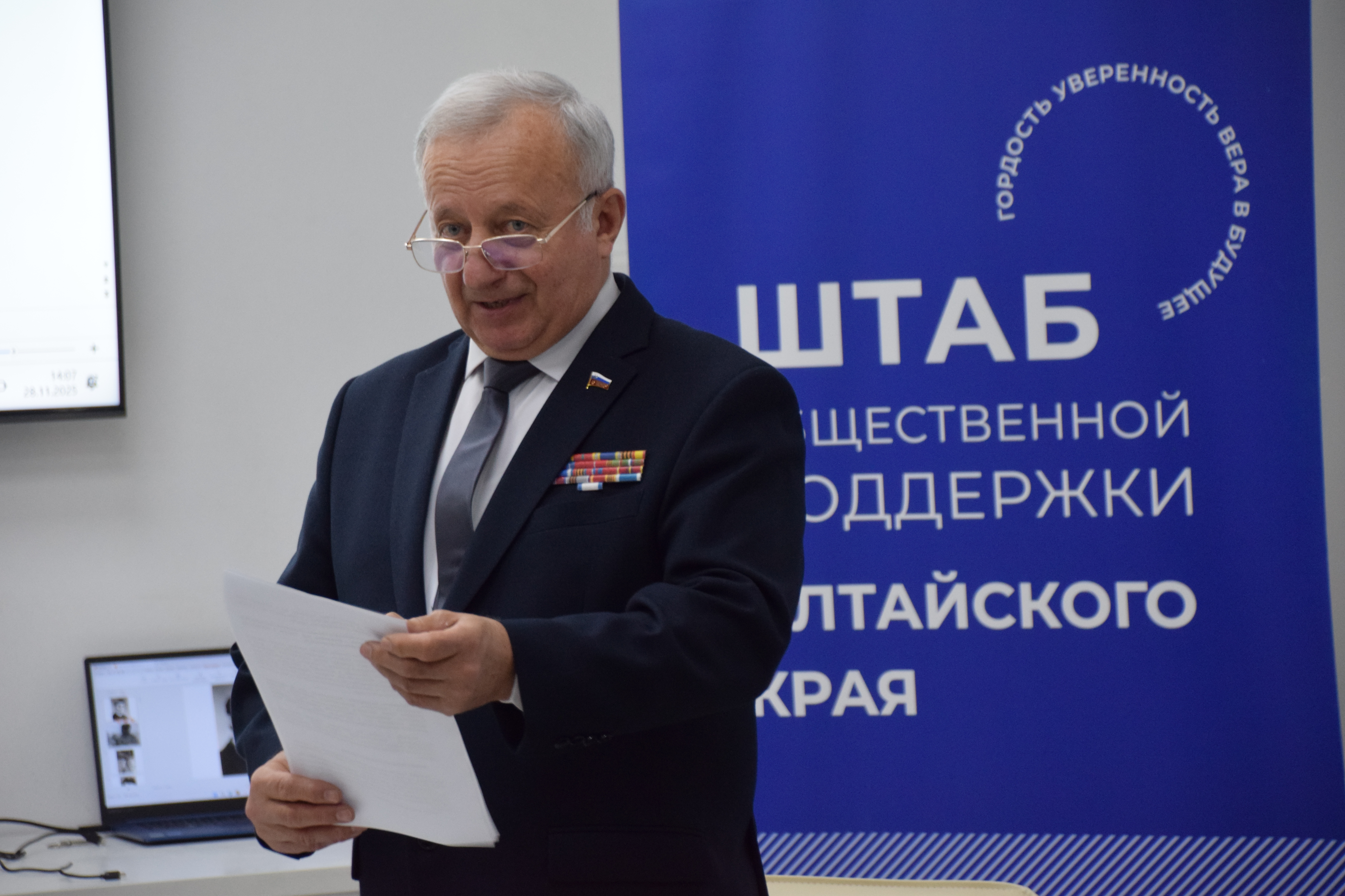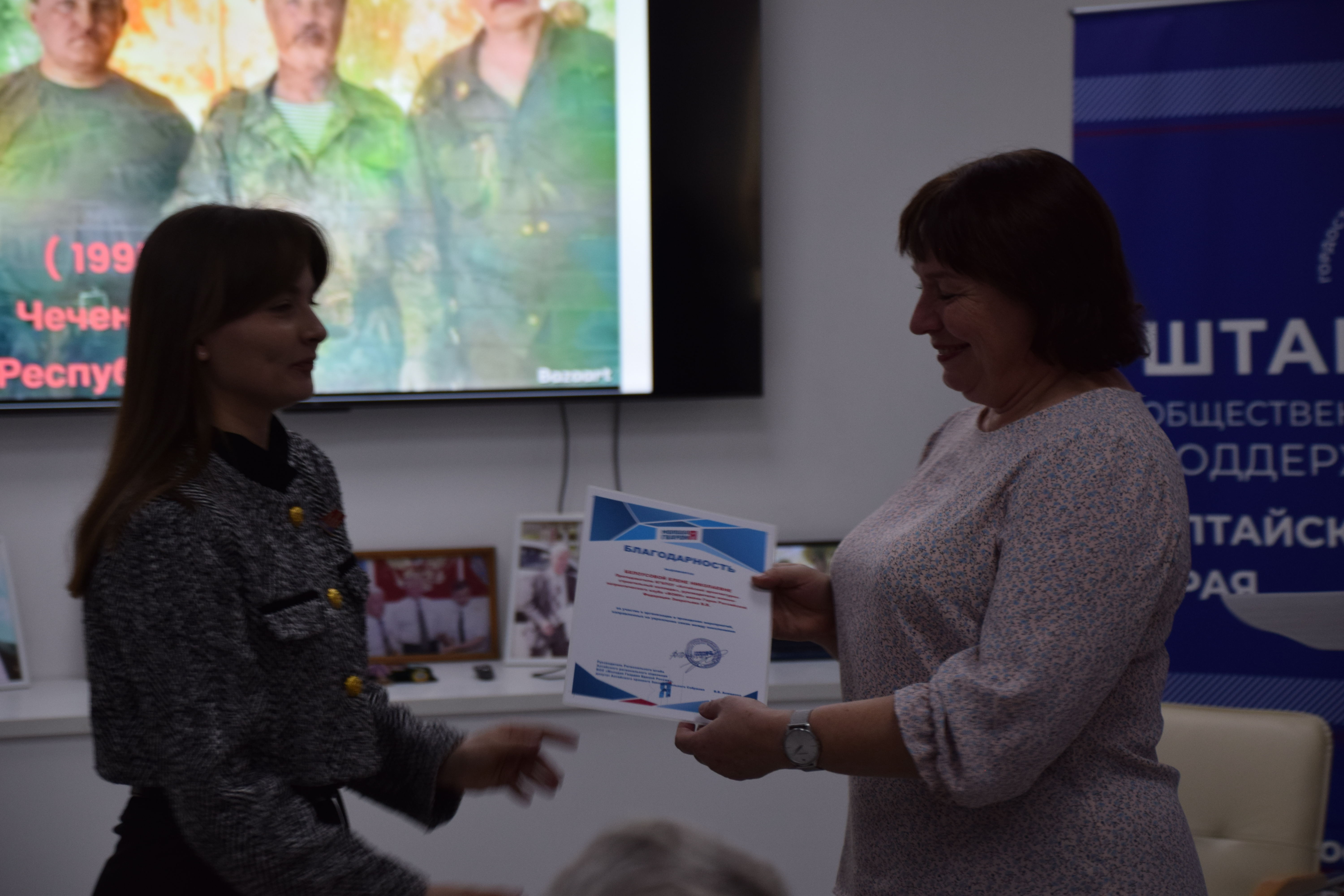 Открыла мероприятие депутат Алтайского краевого Законодательного Собрания Фоменко Виктория Валерьевна. Она подчеркнула особое значение мероприятия для укрепления связи между поколениями, отметила Благодарственным письмом руководителя ВПК «ВОИН» Белоусову Елену Николаевну.