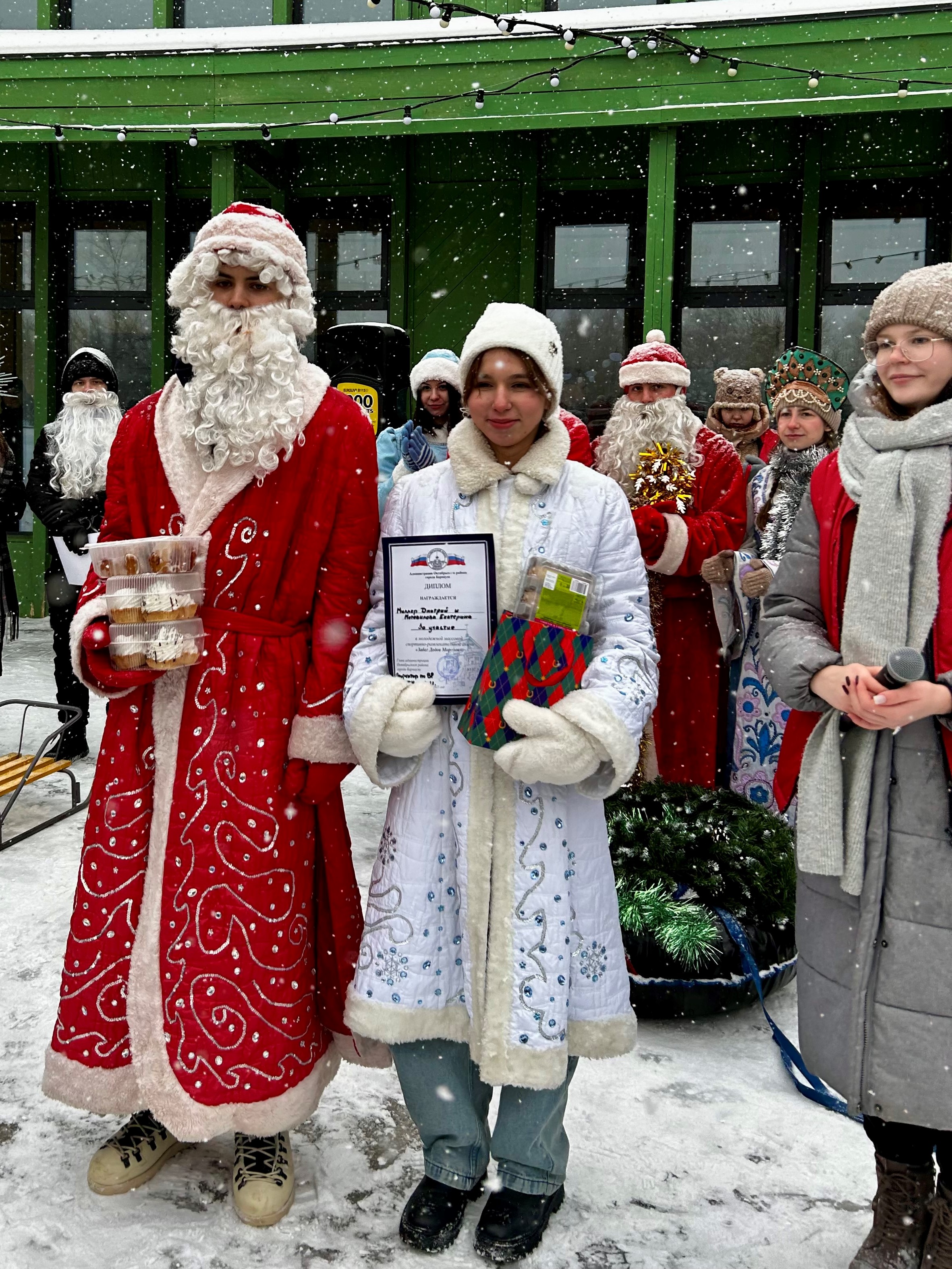Ребята приняли участие в «эпичном сражении Дедов Морозов», что сделало мероприятие ярким и увлекательным. Для детей волонтеры подготовили танцевальную игру, участники которой получили медали и сладкие призы. В конкурсе «Лучшие новогодние санки» отряд занял первое место, выиграв главный приз. Победа стала возможной благодаря творчески украшенным санкам, над которыми девочки работали несколько часов. Над украшением санок трудились Крутикова Мария, Гладченко Виктория, Мотовилова Екатерина, Селина Виктория. Роль Деда Мороза исполнил Миллер Дмитрий. Снегурочкой была Мотовилова Екатерина. Благодаря их ярким образам мероприятие приобрело особую атмосферу и настроение.