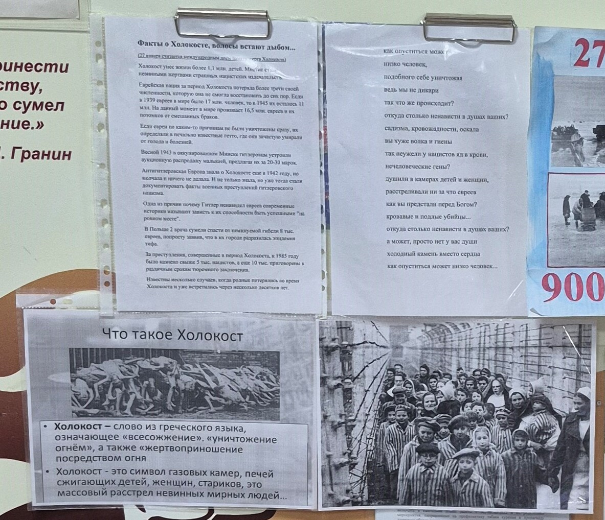 В этот день ребята узнали, что во время Второй мировой воны, на оккупированной Германией территории, были созданы лагеря смерти, предназначенные для убийства миллионов людей. Польский Освенцим стал настоящей «фабрикой смерти». Его узники были обречены на уничтожение голодом, тяжёлой работой и медицинскими преступными экспериментами, как в газовых камерах сжигались трупы людей.