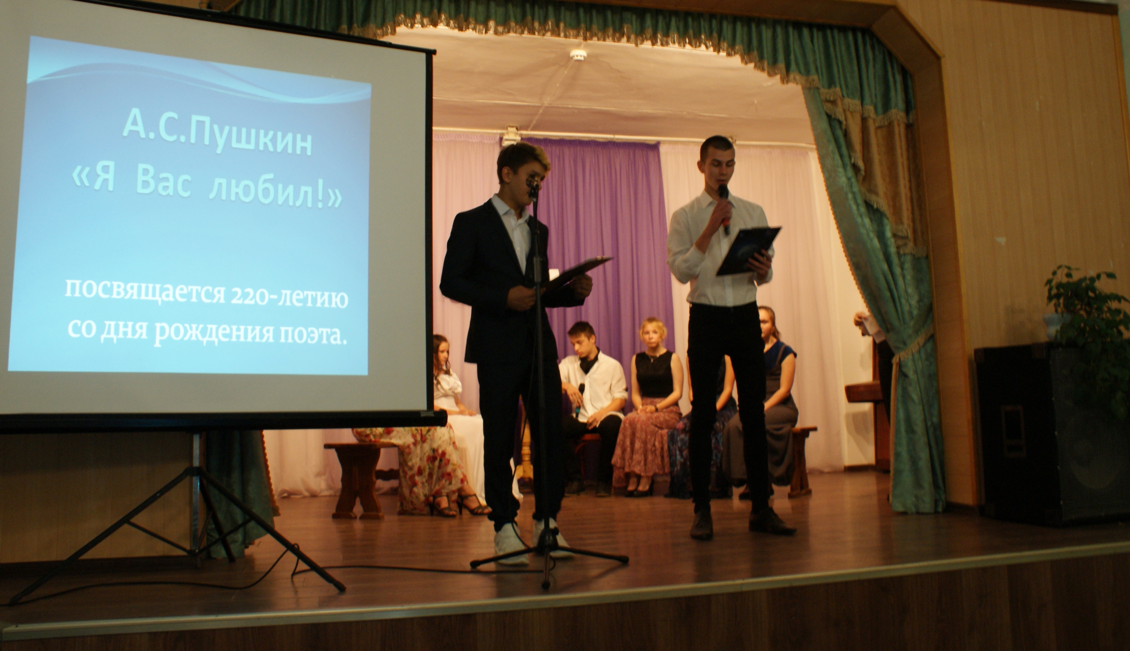 зале корпуса на ул. П.Сухова,71. Вечер, в котором приняли участие  студенты 1 и 2 курсов, был посвящен 220-летию со дня рождения А.С. Пушкина.