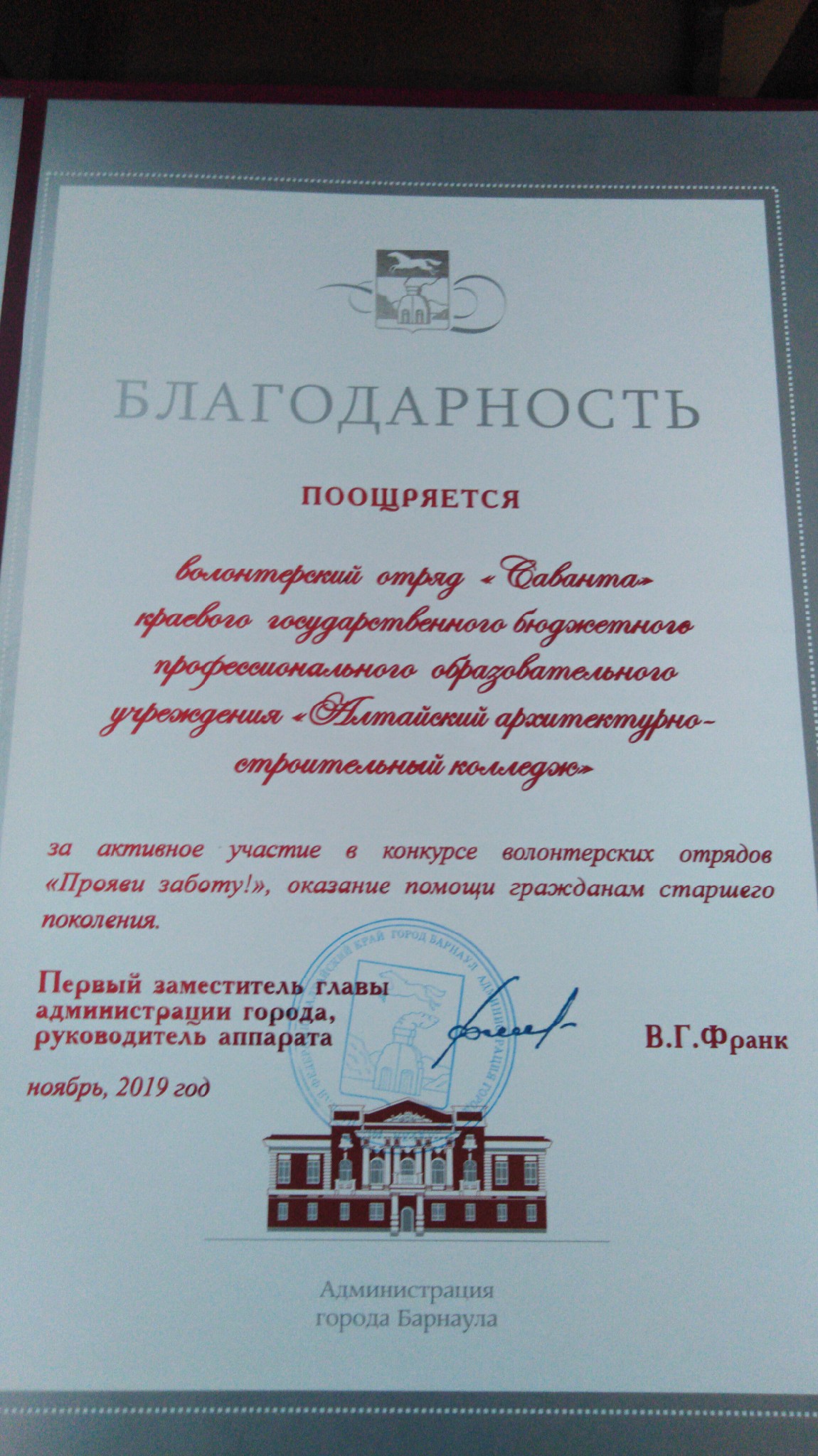 В октябре на территории города Барнаула в рамках месячника пожилого человека комитетом по социальной поддержке населения города Барнаула и с комитетом по делам молодежи администрации города Барнаула был организован конкурс «Прояви заботу-2019!» среди волонтерских отрядов.