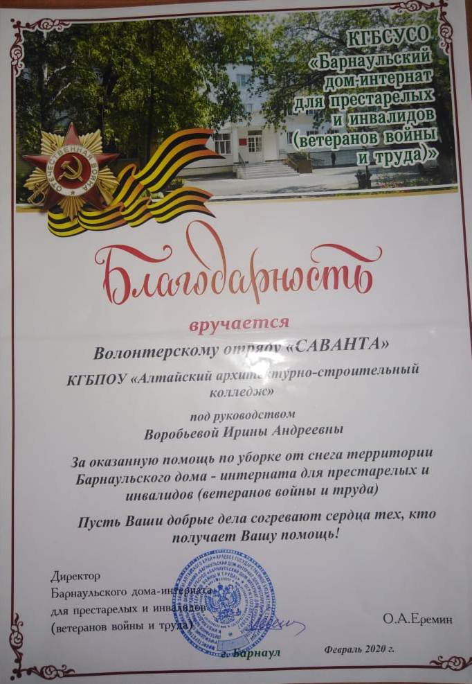 Волонтерский отряд «Саванта» (рук. Воробьёва И.А.) организовал очередную поездку в Барнаульский дом – интернат для престарелых и инвалидов, ветеранов войны и труда. В связи с обильными снежными осадками в помощи нуждаются многие жители нашего города.