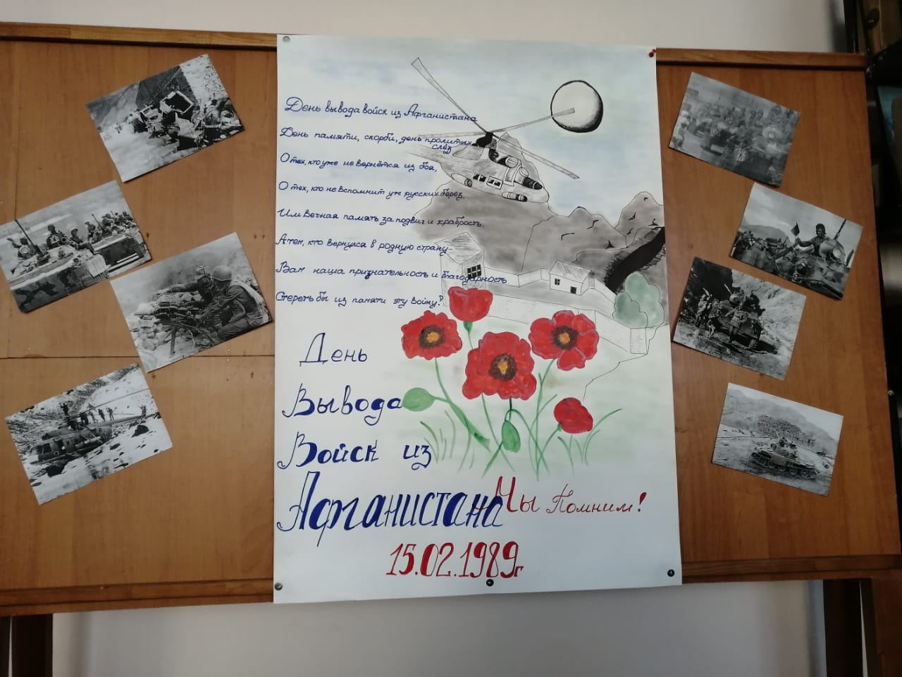 Студенты гр. 20 (Казанина Вика, Королёв Евгений, Димищук Дмитрий) под руководством преподавателя Ведянкиной Т.А. и зав.библиотекой Четвертаковой Т.А. провели библиотечный урок «Молодость, опалённая войной», посвящённый военным событиям в Афганистане. Ребята затронули тему значения присутствия  ограниченного контингента Советской Армии на территории Афганистана, рассказывали о подвигах русских парней, почтили память погибших  воинов-интернационалистов, в том числе и Алексея Сапегина, Кавалера ордена Красной Звезды, выпускника училища №16. На библиотечном уроке использовались материалы тематической книжной выставки, музейные экспонаты. По окончанию мероприятия по лицам ребят было видно, что подвиг воинов-интернационалистов, почти их ровесников, не оставил их равнодушными и нашел отклик в их сердцах.