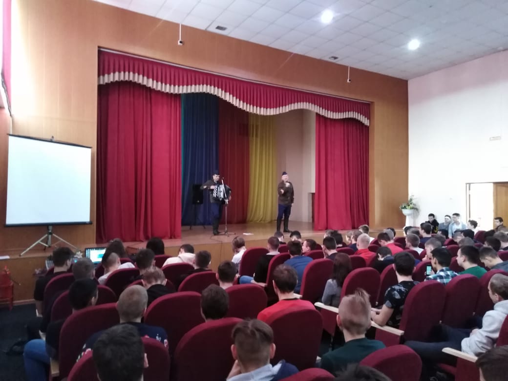 День закончился концертной программой «Синева» в исполнении вокальной группы «Бачи». Песни из репертуара этого коллектива не раз включались в известные сборники. По мнению лидера группы Сергея Пантелеева военные песни  несут в себе особую энергетику. Солисты Сергей Пантелеев и Юрий Колесниковдля студентов исполнили песни, рождённые в Афганской войне. Также ребята услышали знакомые многим песни, посвящённые Победе советских солдат в годы Великой Отечественной войны.Кроме песен, Сергей рассказал об участии российских солдат в афганской войне, где он сам проходил срочную службу. В ходе общения с молодёжью были затронуты такие темы, как  честь, мужество, дружба, патриотизм. На прощание исполнители пожелали студентам любить свою Родину, уважать её историю, стать достойными гражданами своей страны. Ребята ответили бурными аплодисментами.