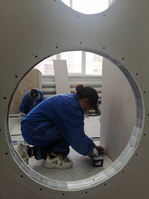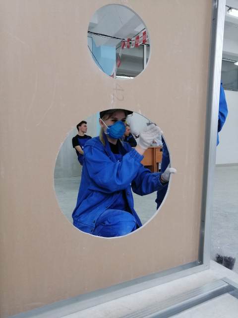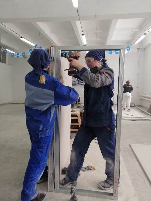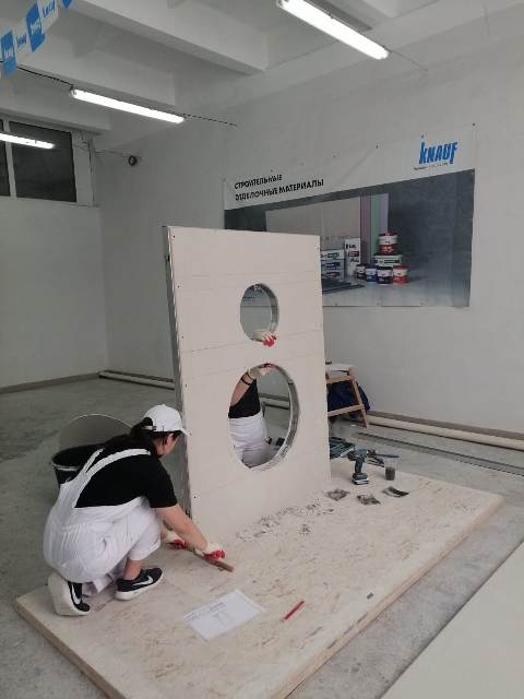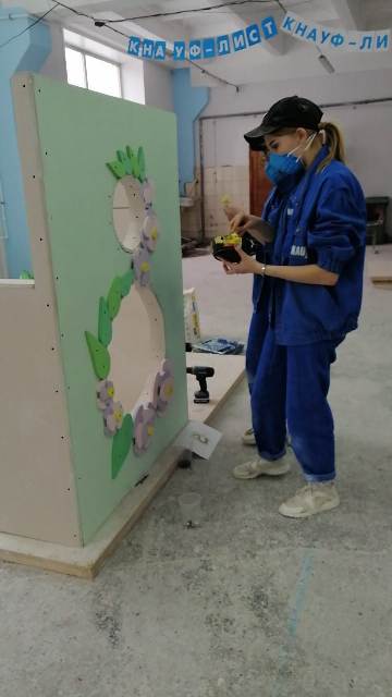 настоящие профессионалы своего дела. Девушки из КГБПОУ «Благовещенский строительный техникум» и КГБПОУ «Алтайский архитектурно-строительный колледж» выполнили сбор конструкции из гипсовых строительных плит по представленным чертежам и декорировали одну из стен.
