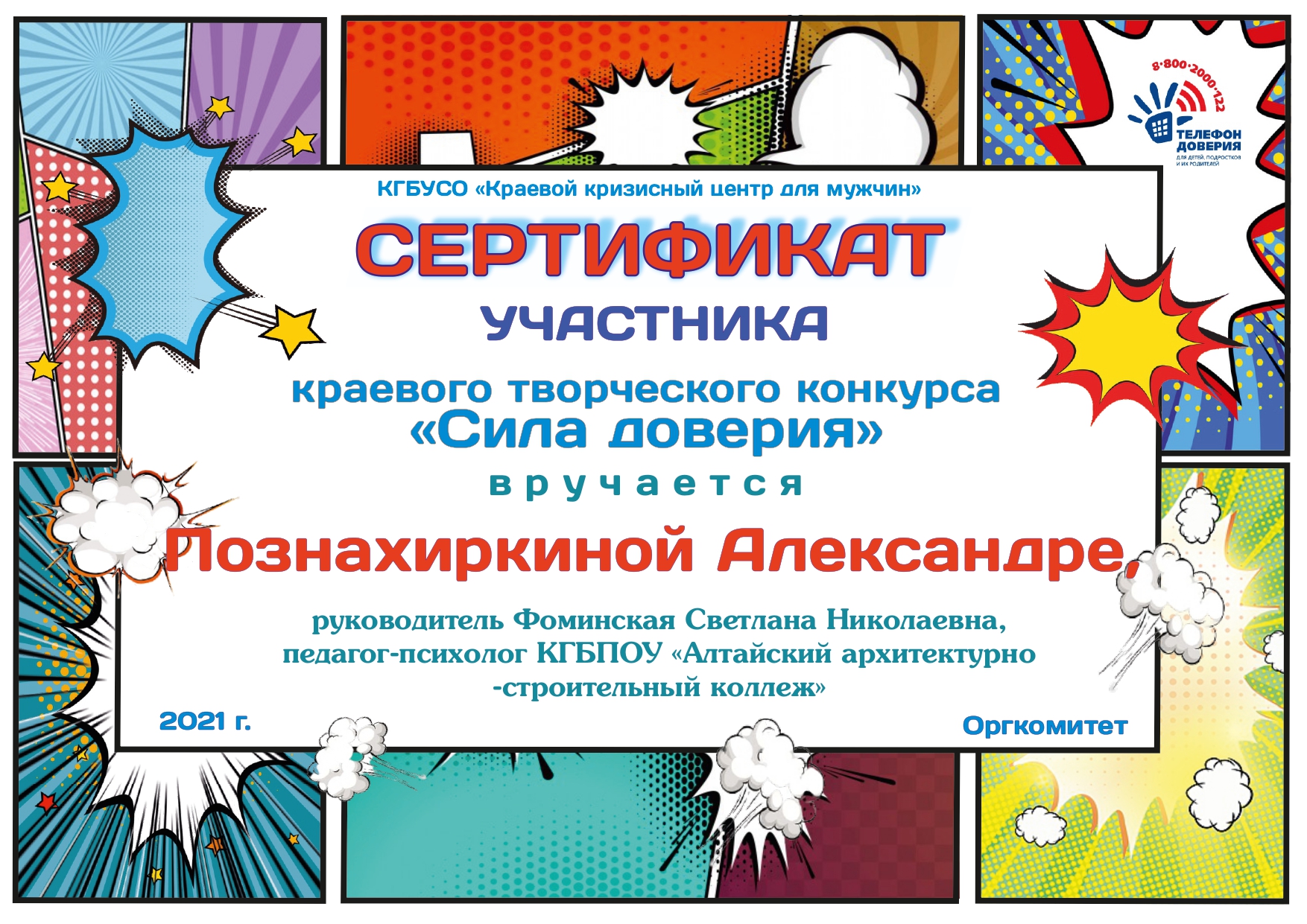 Познахиркиной Александре, Елуниной Дарье,  Горбовскому Дмитрию, Козлову Дмитрию вручены сертификатами участников краевого творческого конкурса «Сила доверия».
