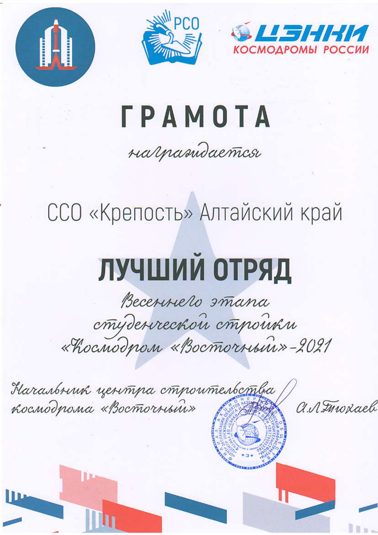 С начала мая  ребята занимались выполнением общестроительных работ на объектах Космодрома Восточный. В отличие от бойцов из других учебных заведений, студенты нашего колледжа находились на строительстве космодрома в рамках выполнения программ производственной практики. Студенты отнеслись к работе с большой ответственностью:  при выполнении кирпичной кладки пятеро бойцов достигли выработки, соответствующей показателям каменщиков 4-го разряда.   Начальник центра строительства «Космодрома Восточный» филиала АО «ЦЭНКИ» ЦИиУС  Алексей Леонидович Тюхаев   был восхищен слаженной, профессиональной работой отлично подготовленных  ребят стройотряда «Крепость»  и вручил им  Благодарственное письмо на имя директора  Алтайского архитектурно-строительного колледжа Виталия Антоновича Баленко.
