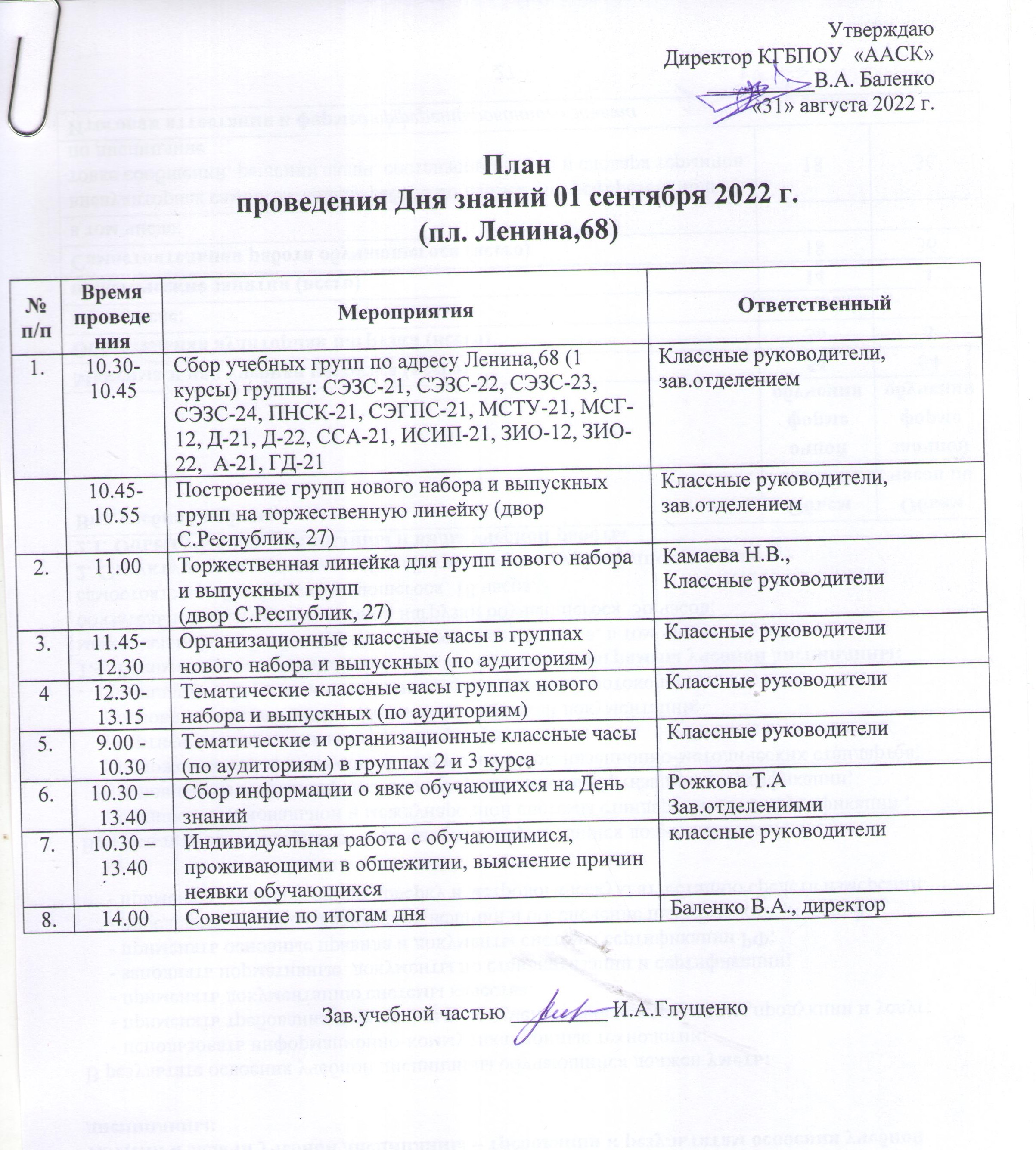 План проведения Дня знаний 1 сентября 2022 года (пл. Ленина, 68)