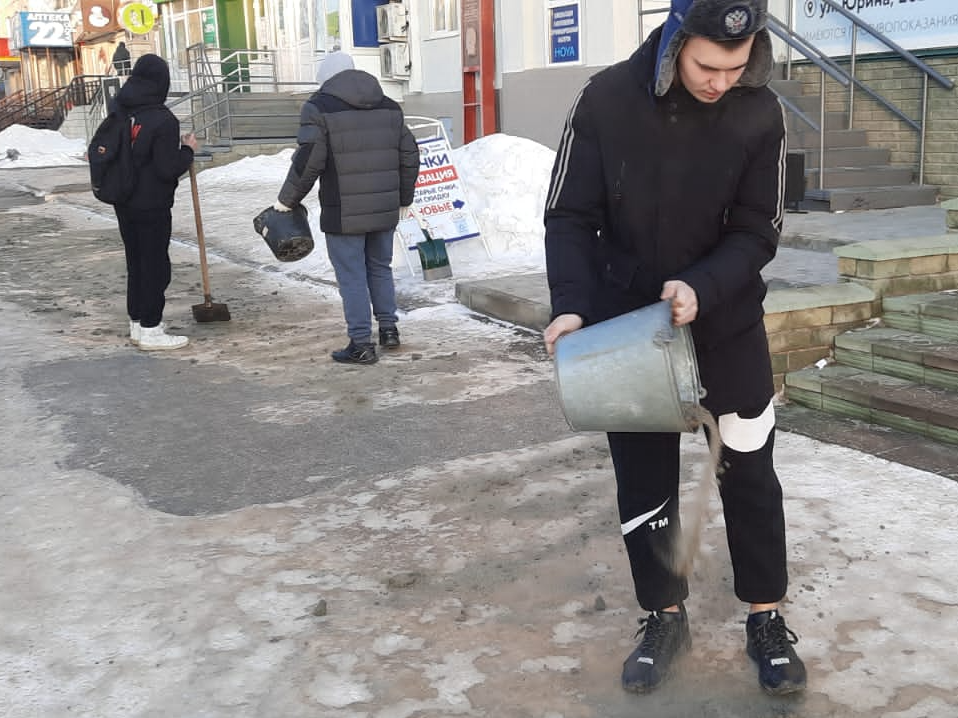 Администрация Ленинского района и волонтерский отряд «Саванта» провели совместную акцию по отсыпке тротуаров песко-соляной смесью.