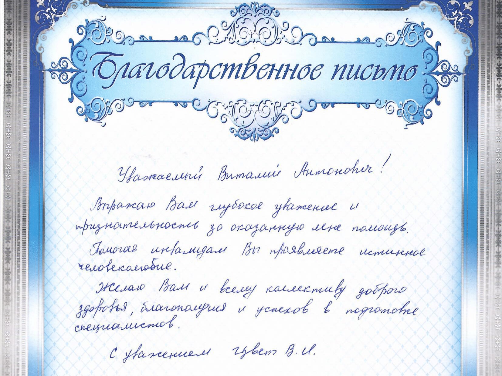 На имя директора колледжа Виталия Антоновича Баленко пришло письмо с благодарностью от Валентины Ивановны Цвет.